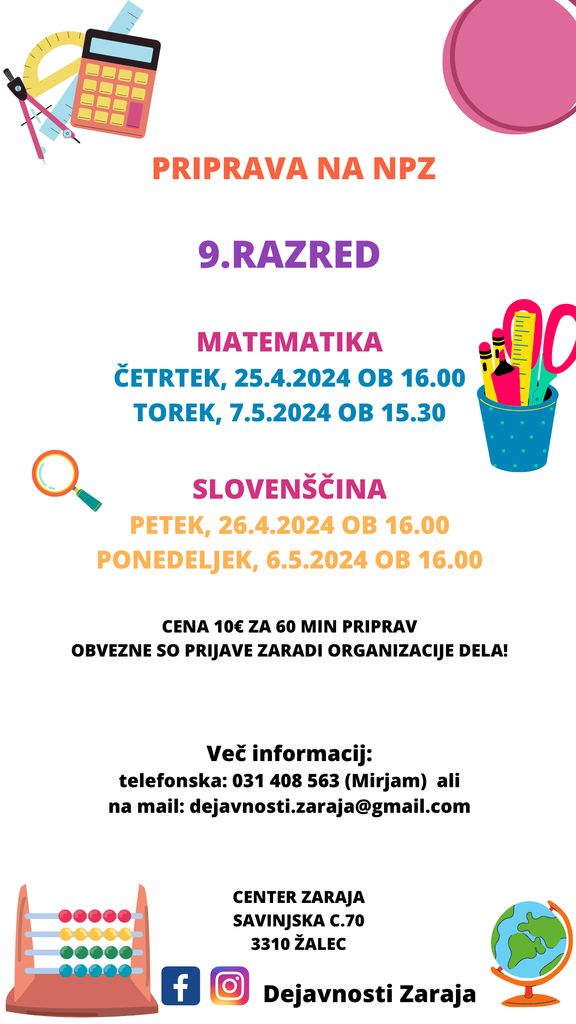 V Centru Zaraja pripravljamo pomoč oziroma priprave za šestošolce in devetošolce pri Nacionalnem preverjanju znanja.