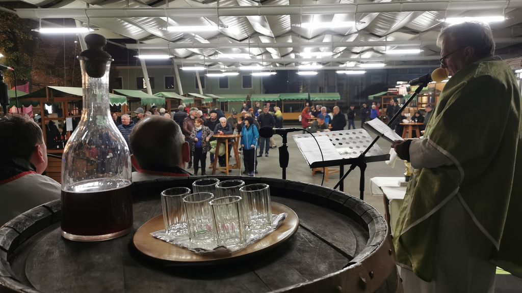 Obiskovalci so bili priča šaljivemu krstu mladega vina, ki ga je opravil škof Miroslav.