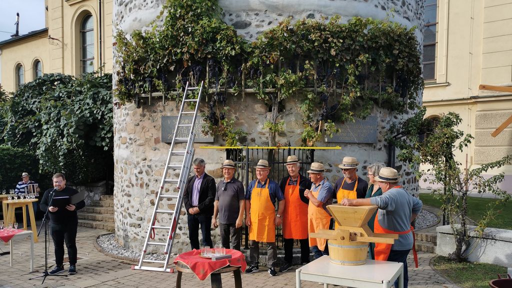 video novica: Trgatev trte Nikolaje pri obrambnem stolpu v Žalcu