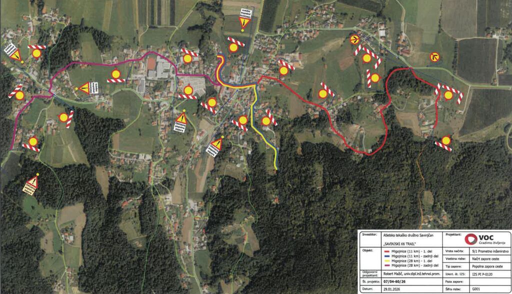 Zaradi izvedbe športne prireditve »SAVINJSKI K6 TRAIL 2026« bodo v soboto 11.4.2026 med 09.00 in 15.00 občasne kratkotrajne popolne zapore v trajanju do 10 minut delov naslednjih javnih občinskih cest: