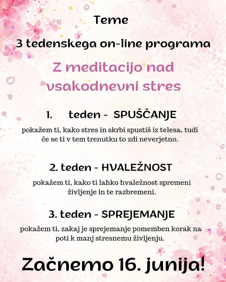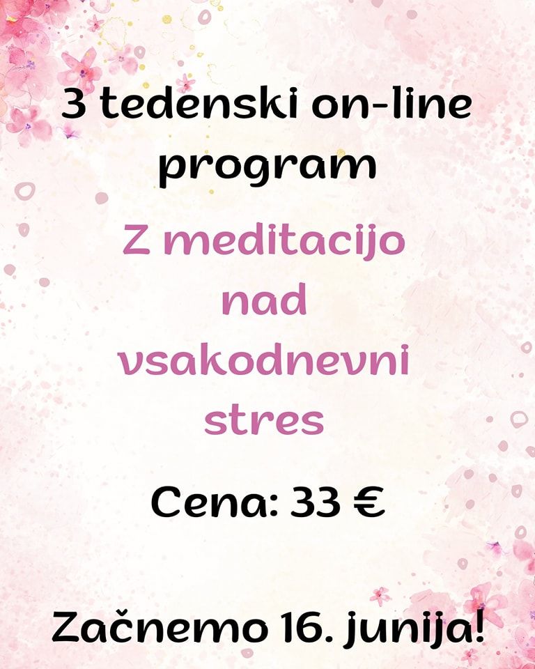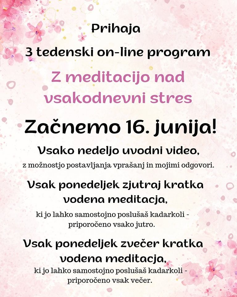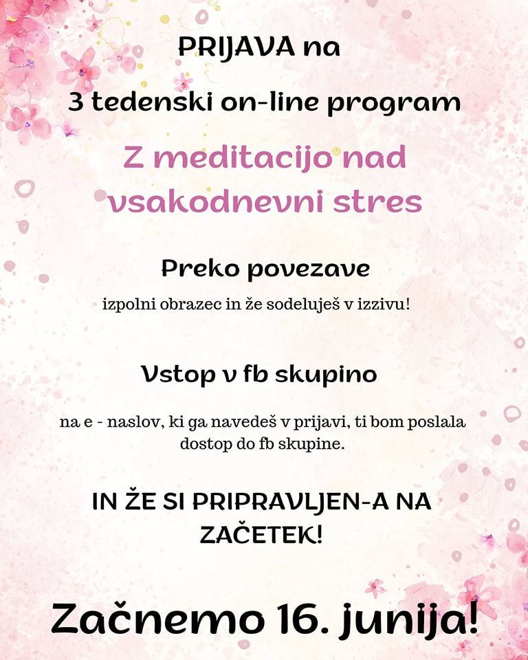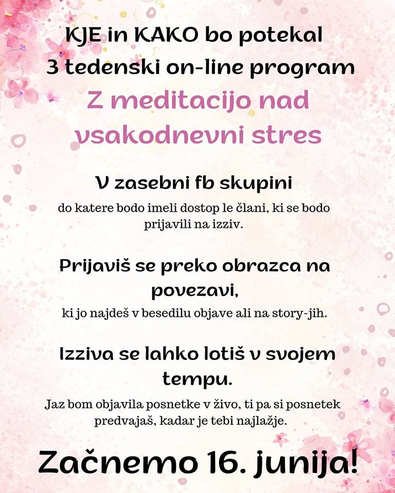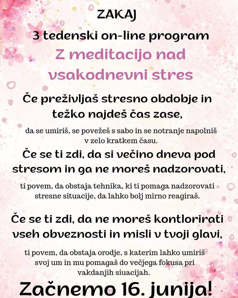 Pridruži se mi v 3 tedenskem spletnem programu Z meditacijo nad vsakodnevni stres. V 21 dneh boš osvojil/a navado, da si vsako jutro in vsak večer vzameš 10 min zase in se razbremeniš stresa. Življenje s tako malo spremembo se ti lahko zelo umiri in postane bolj lahkotno. Tako, da če si tega ne želiš, se vsekakor ne prijavi