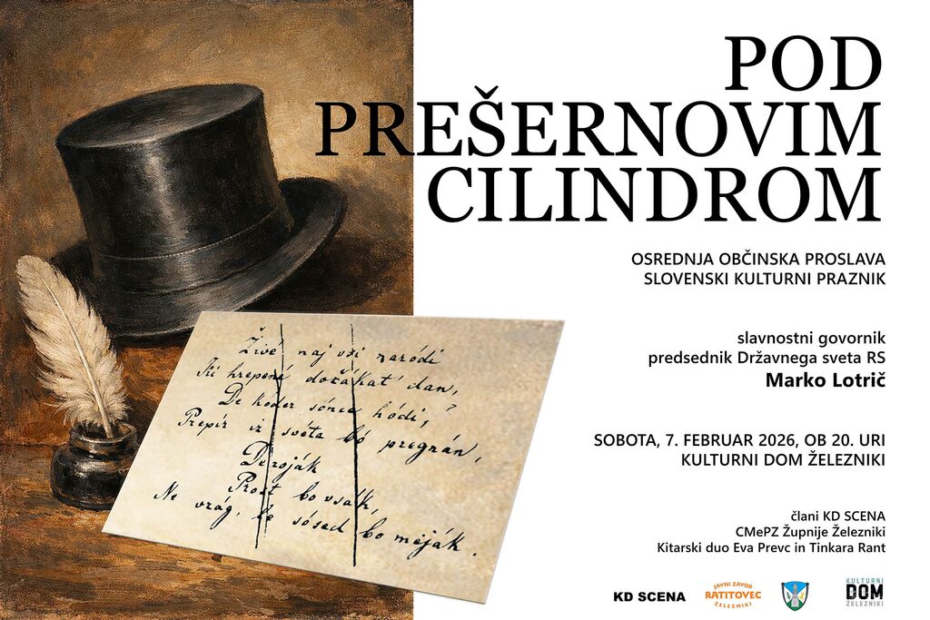 bo v soboto, 7. februarja 2026, ob 20. uri, v kulturnem domu v Železnikih. Pod Prešernovim cilindrom Prireditev