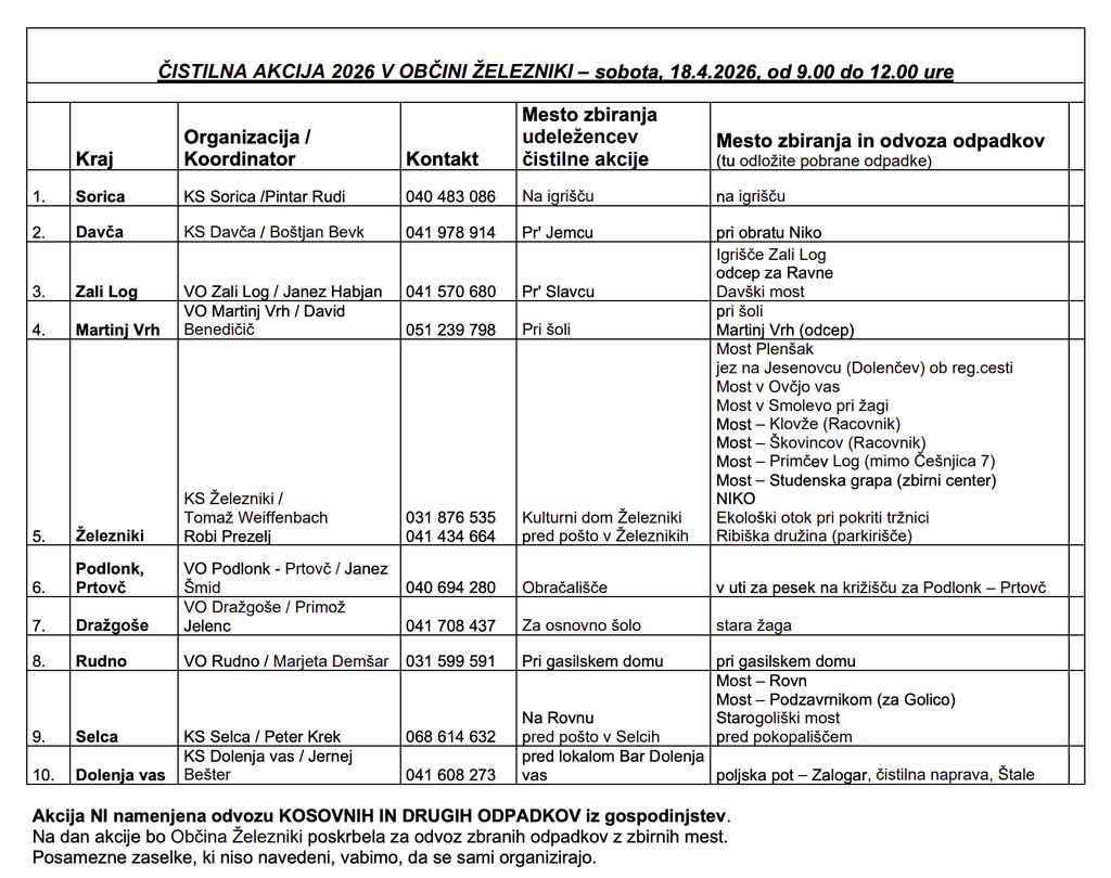 ČISTILNA AKCIJA 2026 V OBČINI ŽELEZNIKI - sobota, 18.4.2026, od 9.00 do 12.00 ure