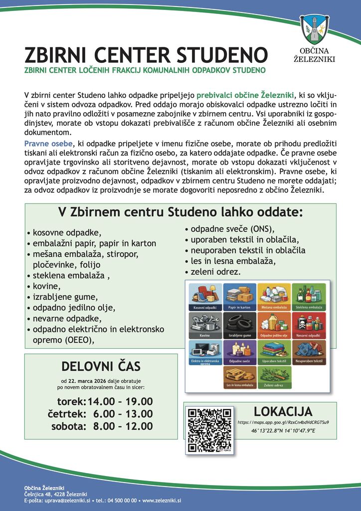 Občina Železniki obvešča, da bo od 22. 3. 2026 dalje pričel veljati nov delovni čas Zbirnega centra Studeno: