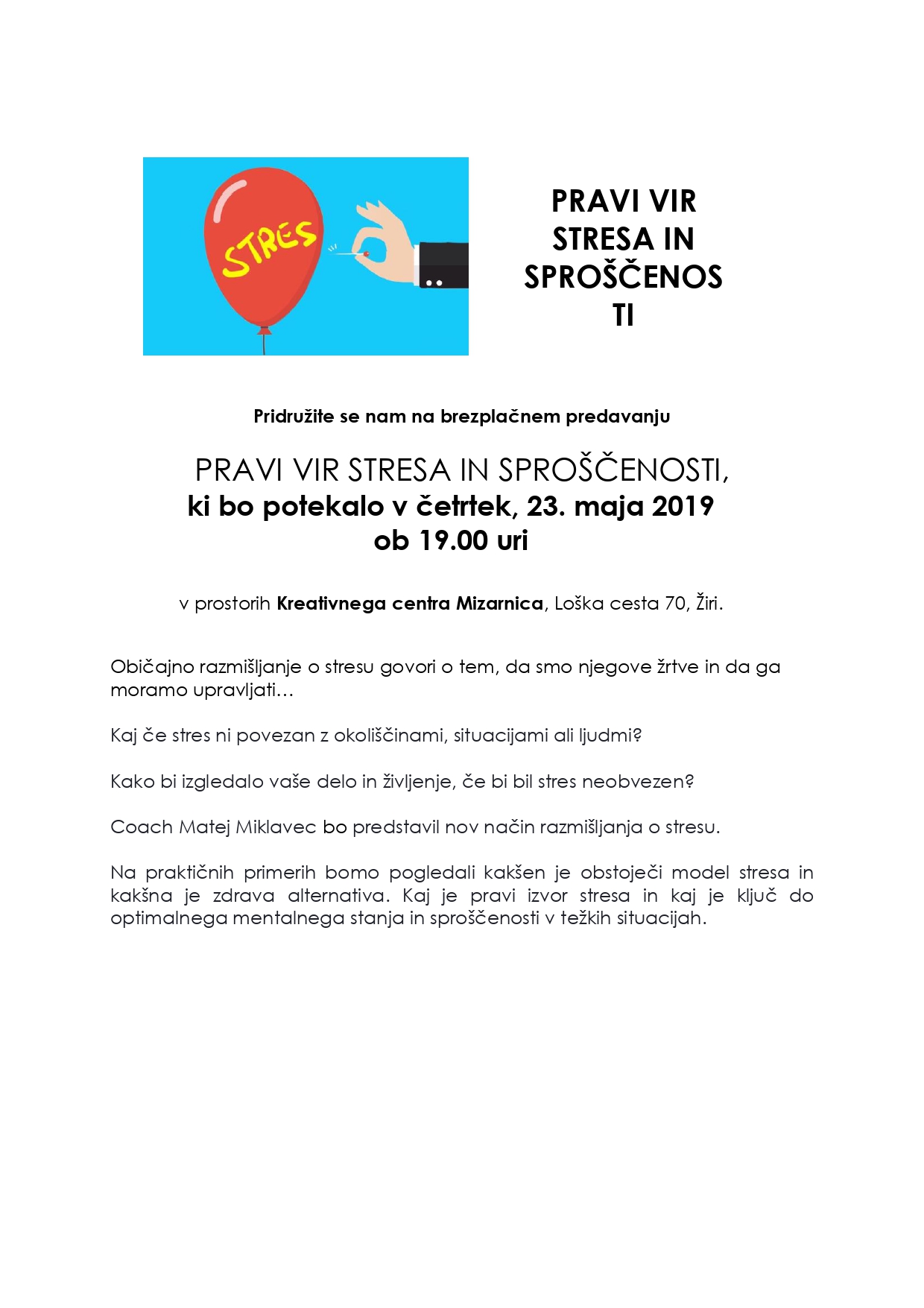 Na praktičnih primerih bomo pogledali kakšen je obstoječi model stresa in kakšna je zdrava alternativa. Kaj je pravi izvor stresa in kaj je ključ do optimalnega mentalnega stanja in sproščenosti v težkih situacijah.