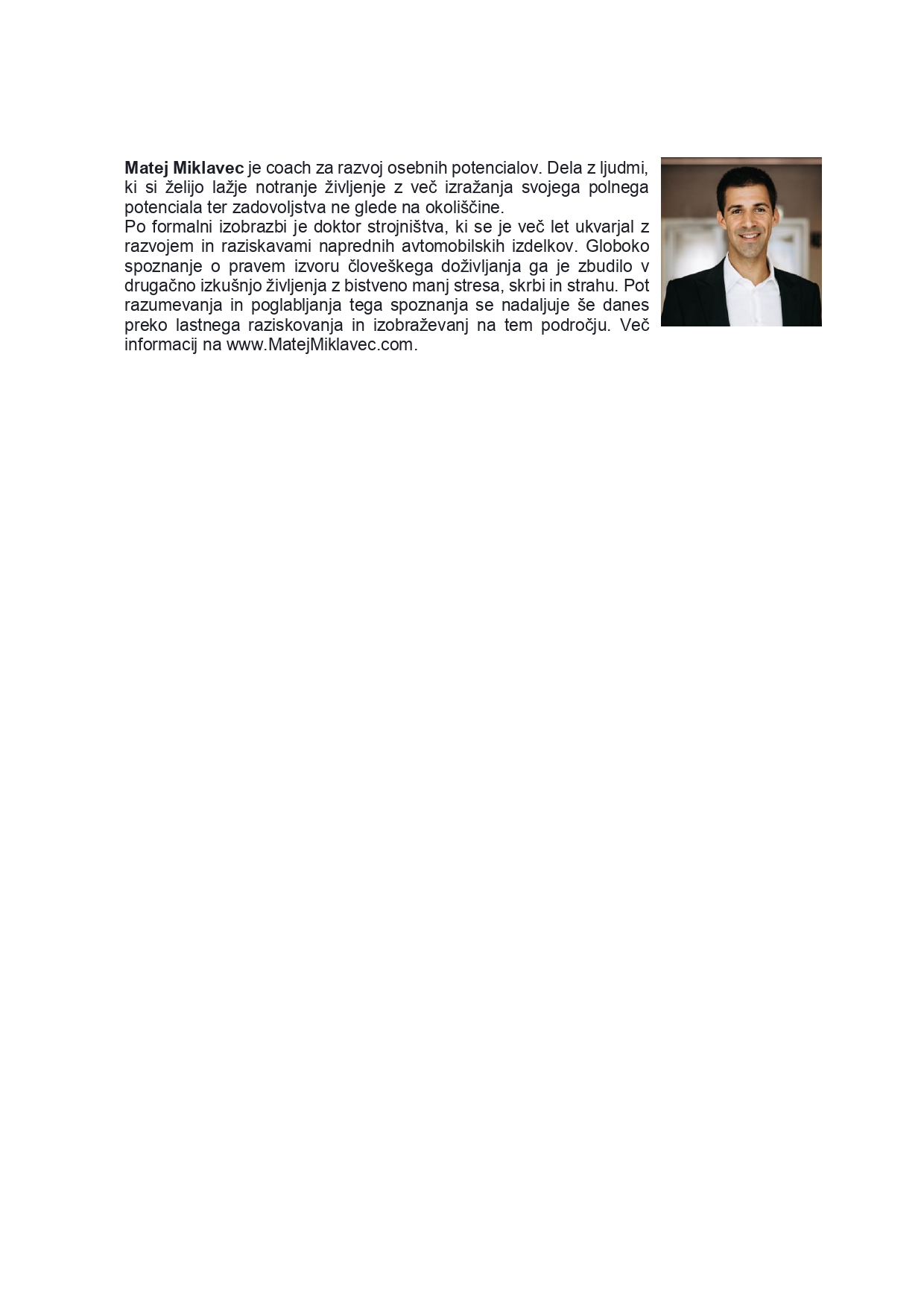 Po formalni izobrazbi je doktor strojništva, ki se je več let ukvarjal z razvojem in raziskavami naprednih avtomobilskih izdelkov. Globoko spoznanje o pravem izvoru človeškega doživljanja ga je zbudilo v drugačno izkušnjo življenja z bistveno manj stresa, skrbi in strahu. Pot razumevanja in poglabljanja tega spoznanja se nadaljuje še danes preko lastnega raziskovanja in izobraževanj na tem področju. Več informacij na www.MatejMiklavec.com.