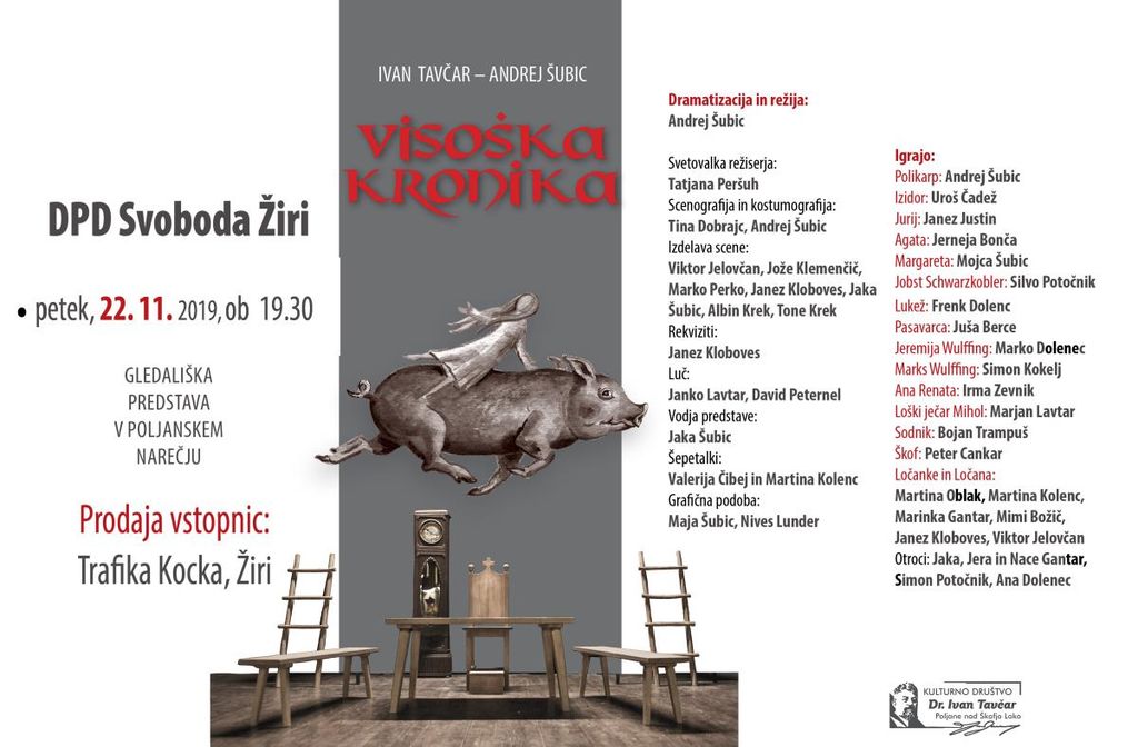Ob 100-letnici izida Visoške kronike pisatelja Ivana Tavčarja je tudi Kulturno društvo Ivan Tavčar Poljane pripravilo odrsko predstavo znamenitega kronikalnega romana. Dramatizacija romana in režija je v izkušenih rokah Andreja Šubica, seveda v poljanskem narečju. Obeta se nam žlahten gledališki dogodek!