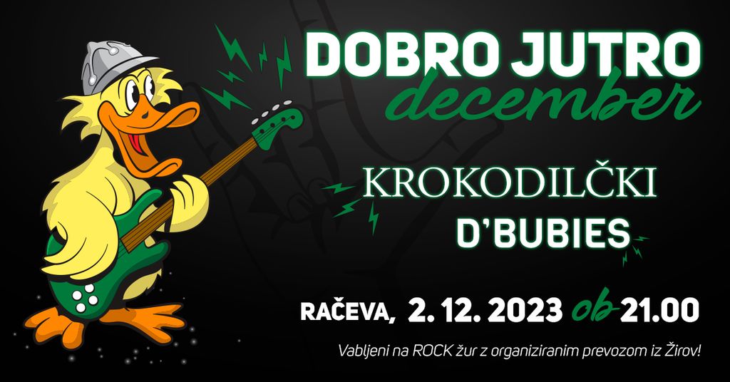 PGD Račeva v Račevi prireja rock žur s skupino KROKODILČKI in D'BUBIES. Poskrbljeno bo za dobro glasbo, pijačo, kakšen prigrizek. Urejen bo prevoz udeležencev na relaciji Račeva-Žiri, (tel.: 051 340 667), da se bomo lahko vsi brez skrbi prebudili v novo jutro veselega decembra.