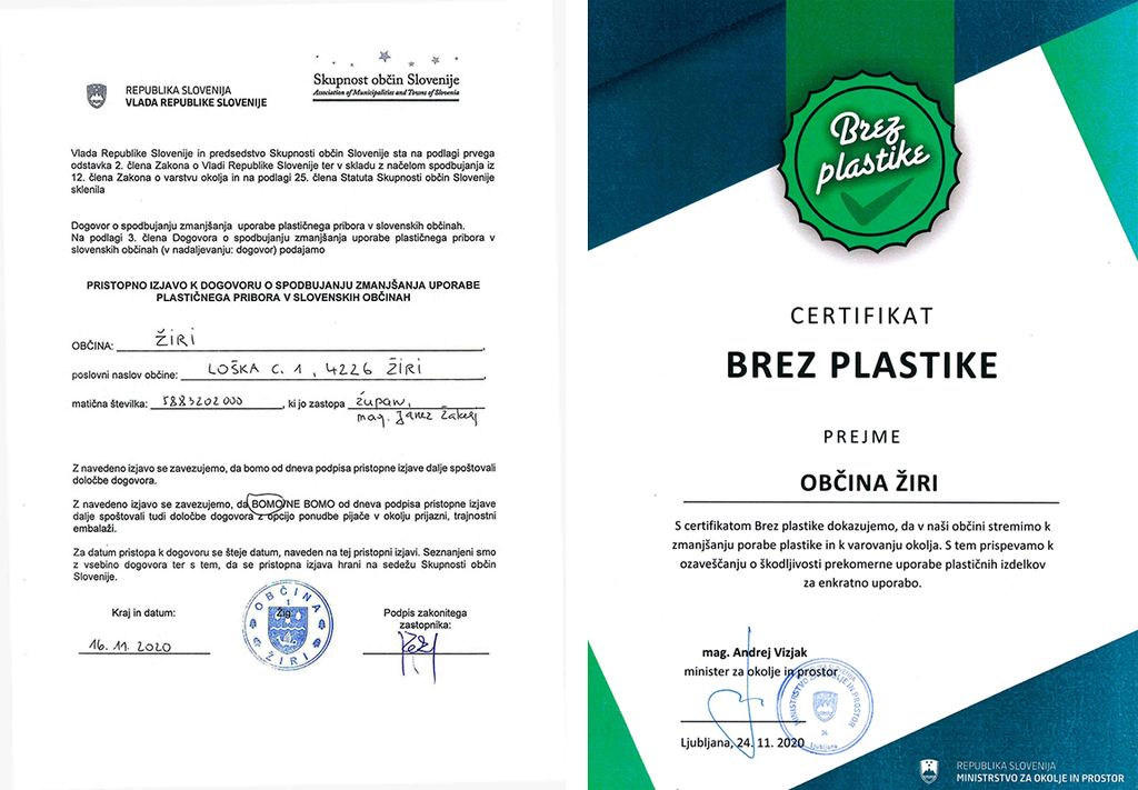 Občina Žiri je certifikat dobila potem, ko je župan Občine Žiri mag. Janez Žakelj v novembru podpisal pristopno izjavo k Dogovoru o spodbujanju zmanjšanja uporabe plastičnega pribora v slovenskih občinah. Certifikat “Brez plastike” je izdalo Ministrstvo za okolje in prostor, podpisal pa ga je okoljski minister mag. Andrej Vizjak.