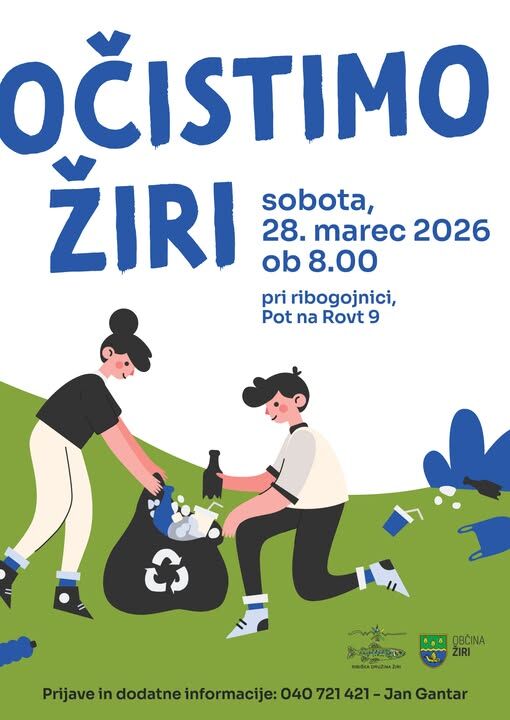 Vabimo vsa društva in posameznike, ki vam je mar za to, v kakšnem okolju živite, da se pridružite akciji OČISTIMO ŽIRI 2026. Glavni organizator je Ribiška družina Žiri v sodelovanju z Občino Žiri. Čistilna akcija bo potekala v soboto, 28. marca. V primeru slabega vremena se akcija prestavi na soboto, 11. aprila.