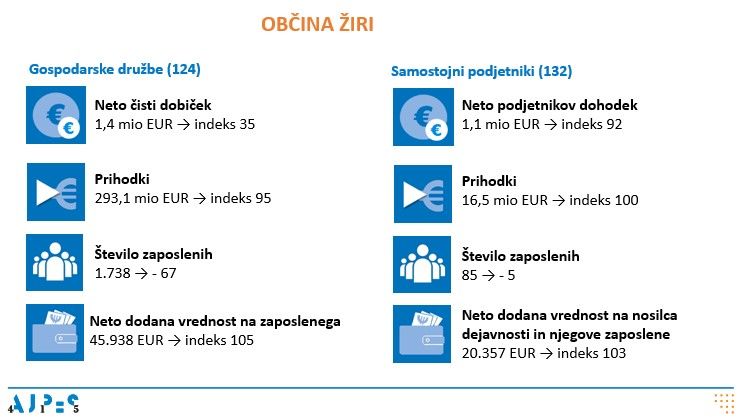 Za leto 2024 je AJPES predložilo podatke iz letnih poročil na poenotenih obrazcih za državno statistiko tudi 124 gospodarskih družb in 132 samostojnih podjetnikov s sedežem v občini Žiri.