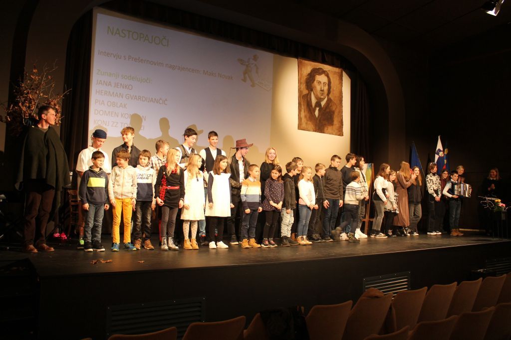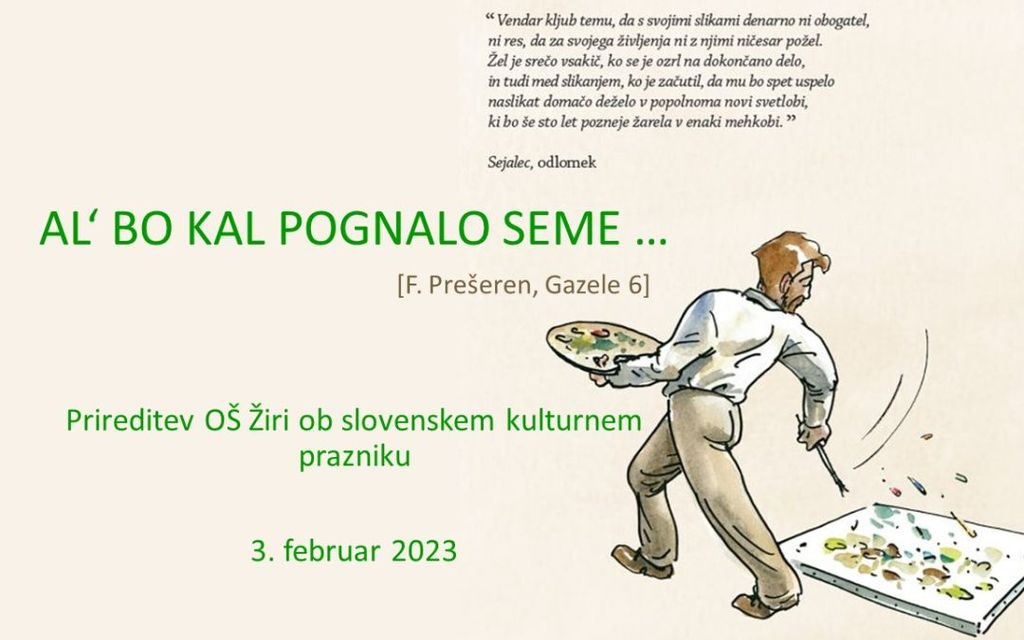 Al’ bo kal pognalo seme … je bil naslov letošnje prireditve pred slovenskim kulturnim praznikom. Bila je tematsko obarvana – učenci so uprizorili Prešernovo Turjaško Rozamundo. Nismo pa pozabili na druge slovenske pesnike in slikarje, v zanimivi vlogi – kot portretiranci – smo se znašli tudi tisti, ki vsakodnevno zahajamo v Osnovno šolo Žiri. Objavili pa smo tudi intervju z aktualnim Prešernovim nagrajencem za življenjsko delo, slikarjem Hermanom Gvardjančičem. Posnetek proslave si lahko ogledate spodaj.