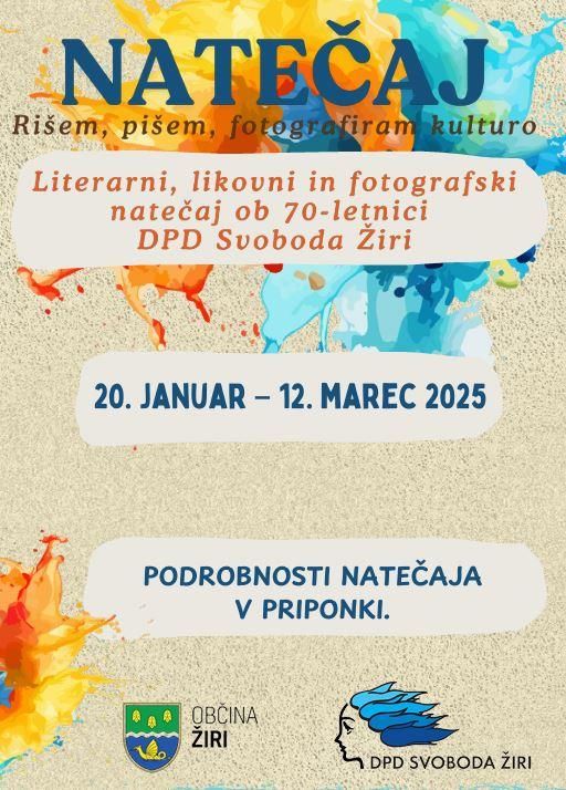 Ob praznovanju 70-letnice delovanja DPD Svoboda Žiri vas vabimo k sodelovanju na literarnem, likovnem in fotografskem natečaju z naslovom "Rišem, pišem, fotografiram kulturo". Natečaj je namenjen osnovnošolcem, srednješolcem in odraslim, ki želijo izraziti svoje ustvarjalne misli in ideje o kulturi ter njenem pomenu v naših življenjih.