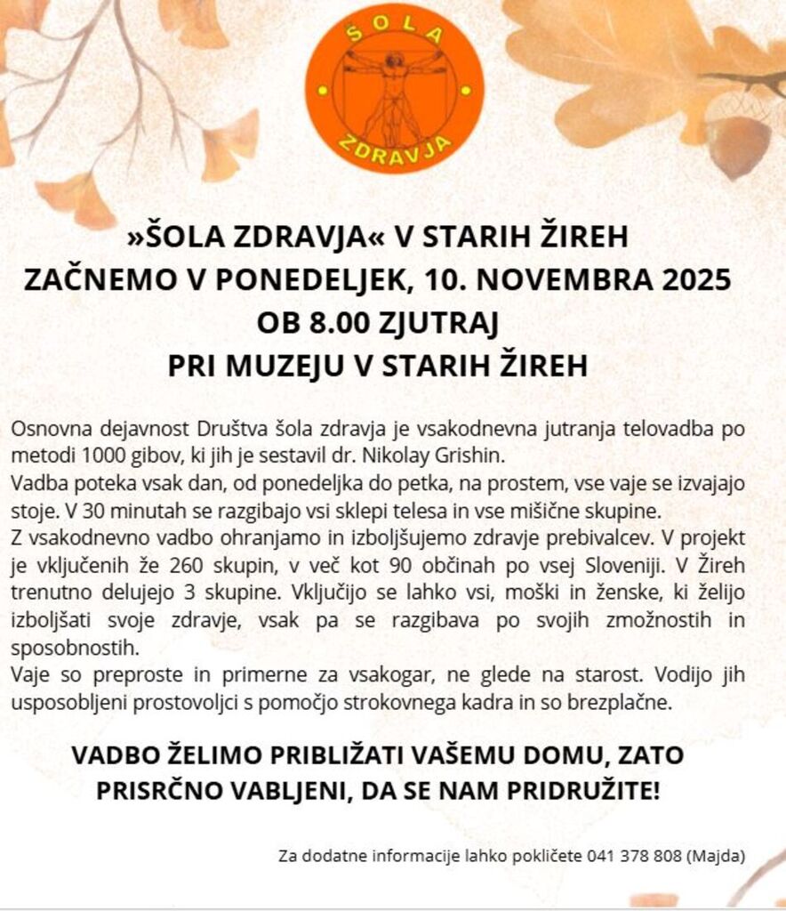 V ponedeljek 10. 11. pričenja z vadbo nova, četrta skupina Šole zdravja Žiri, ki jo bo vodila prostovoljka in voditeljica Majda Dragovan. Vadba bo potekala vsak dan zjutraj ob 8h pred muzejem v Starih Žireh.