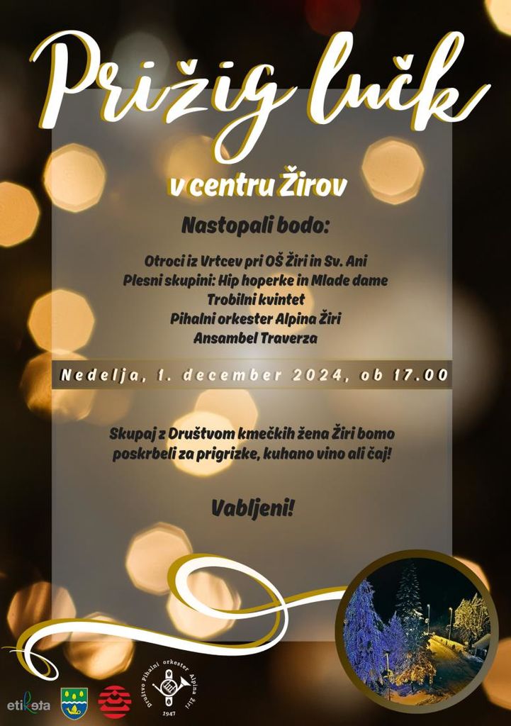 Vabljeni na dogodek ob prižigu decembrskih luči v Žireh, ki ga v nedeljo, med 17. in 20. uro, v centru Žirov organizira Pihalni orkester Alpina Žiri v sodelovanju z Občino Žiri.