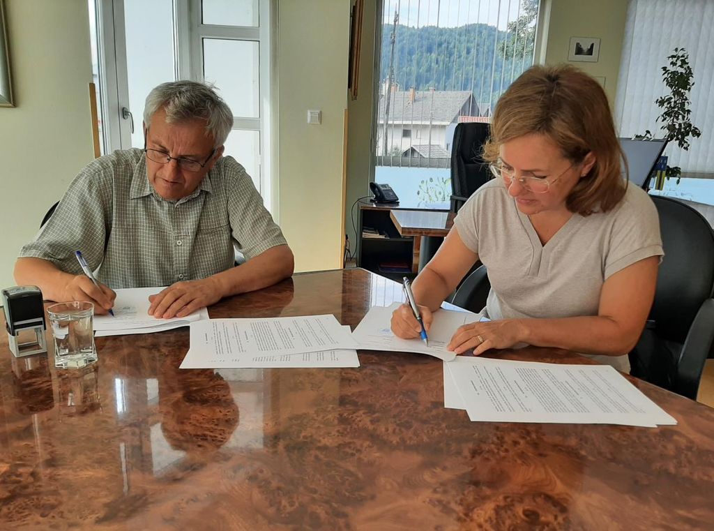 Direktorica podjetja Arhinom d.o.o., Nika Mohorič in podžupan Jože Stanonik sta danes podpisala pogodbo za izdelavo projektne dokumentacije za prenovo Zdravstvene postaje Žiri.