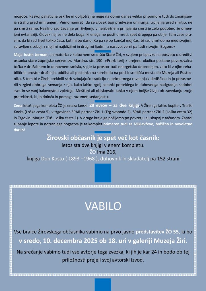 Vse bralce Žirovskega občasnika vabimo na prvo javno predstavitev ŽO 55, ki bo v sredo, 10. decembra 2025 ob 18. uri v galeriji Muzeja Žiri.