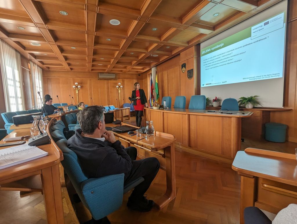 Katarina Sladoljev, vodja projektov z Razvojne agencije Sora je predstavila glavne projektne aktivnosti in njegove ključne rezultate. Osrednji namen projekta je pospešiti prehod na bolj krožno gospodarstvo in učinkovitejšo rabo virov industrijskih conah/parkih alpskih regij.