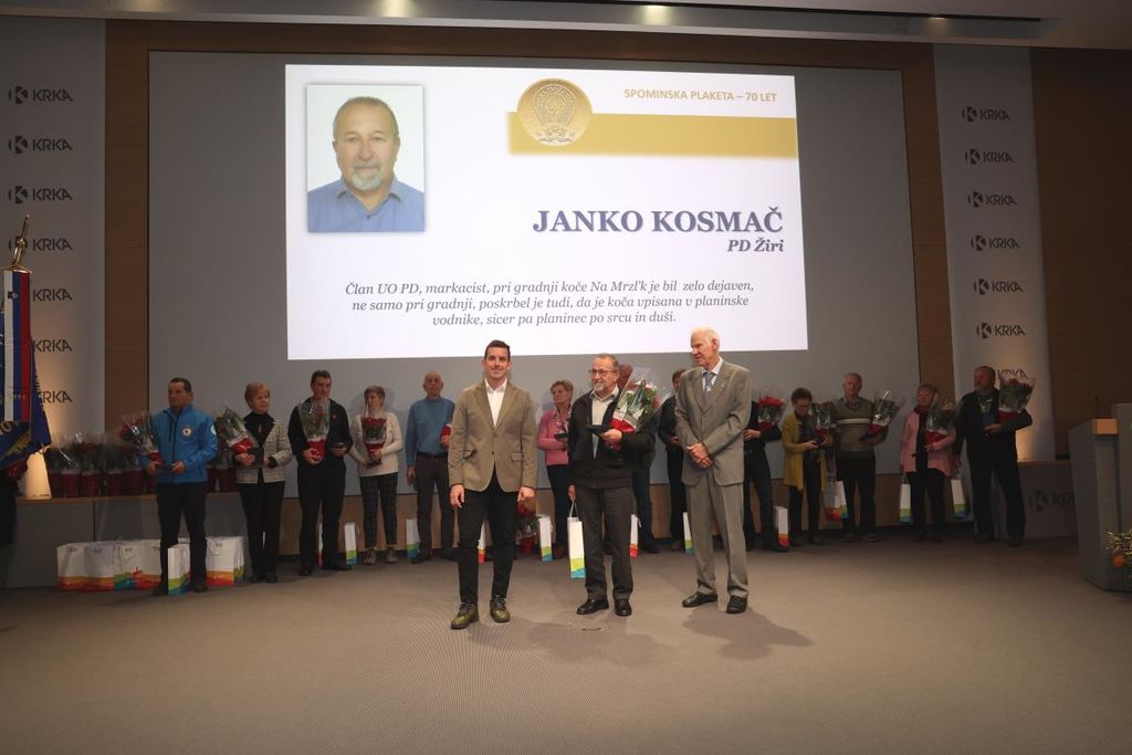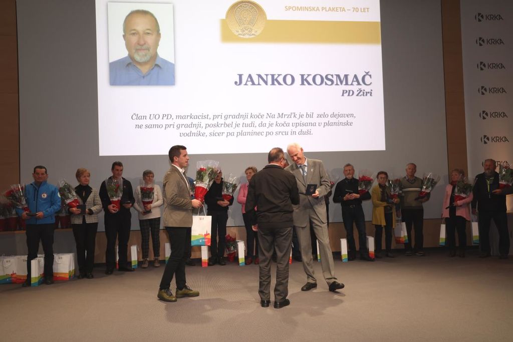 Med prejemniki spominske plakete je tudi član upravnega odbora Planinskega društva Žiri Janko Kosmač. Priznanje je prejel za dolgoletno prizadevno in izjemno uspešno delo v društvu, kjer se je še posebej izkazal pri gradnji in upravljanju Koče na Mrzlk ter vodenju gospodarske komisije. S svojim delom, požrtvovalnostjo in skromnostjo je Janko Kosmač lahko zgled in spodbuda ostalim članom društva. Njegova delavnost in skrb za naravo, okolje in ljudi je povezana tudi z neprestanim izobraževanjem, saj se je pred leti dejavno priključil tudi markacistom PZS.