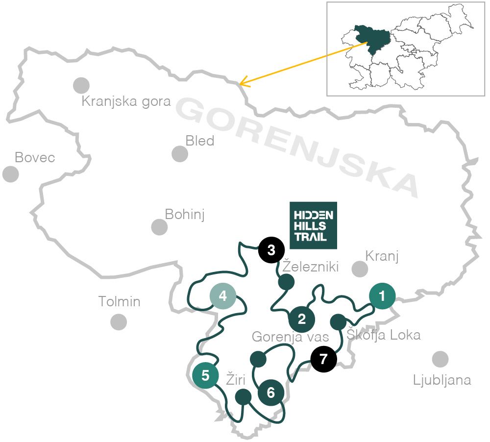 Hidden Hills Trail je daljinska kolesarska pot, ki povezuje štiri občine Škofjeloškega in različne turistične točke. Kolesarski krog, ki ga sestavlja 7 etap v skupni dolžini 240 km je prilagojen tudi za električna kolesa.
