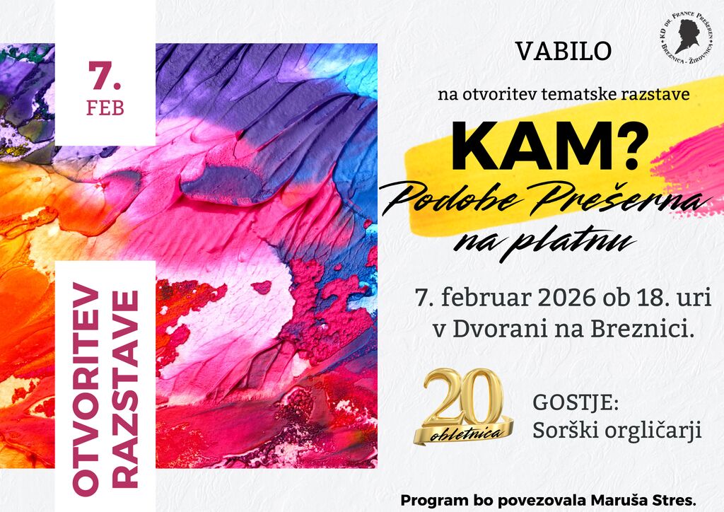 Ob slovenskem kulturnem prazniku vas Kulturno društvo dr. France Prešeren Žirovnica-Breznica vabi na ogled tematske slikarske razstave Podobe Prešerna na platnu. V kulturni dvorani na Breznici bodo na ogled slike nastale na letošnjem jubilejem 20. slikarskem srečanju z naslovno temo "Kam".