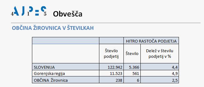 Po podatkih Poslovnega registra Slovenije (stanje na dan 10. 12. 2018) je bilo v občini Žirovnica registriranih 430 poslovnih subjektov, od tega je bilo v obdobju od 1. 1. – 10. 12. 2018 novoustanovljenih: