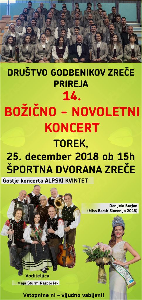 Društvo godbenikov Zreče prireja 14.BOŽIČNO - NOVOLETNI KONCERT, ki bo v TOREK, 25. DECEMBRA 2018 ob 15-ti uri v ŠPORTNI DVORANI v Zrečah.