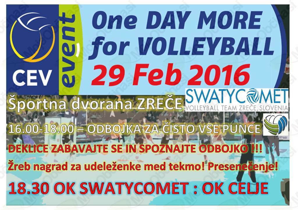 V sklopu projekta Evropske odbojkarske zveze "OneDayMore4Volleyball" vas vabimo na prijateljsko tekmo med OK Swatycomet Zreče in OK Celje.