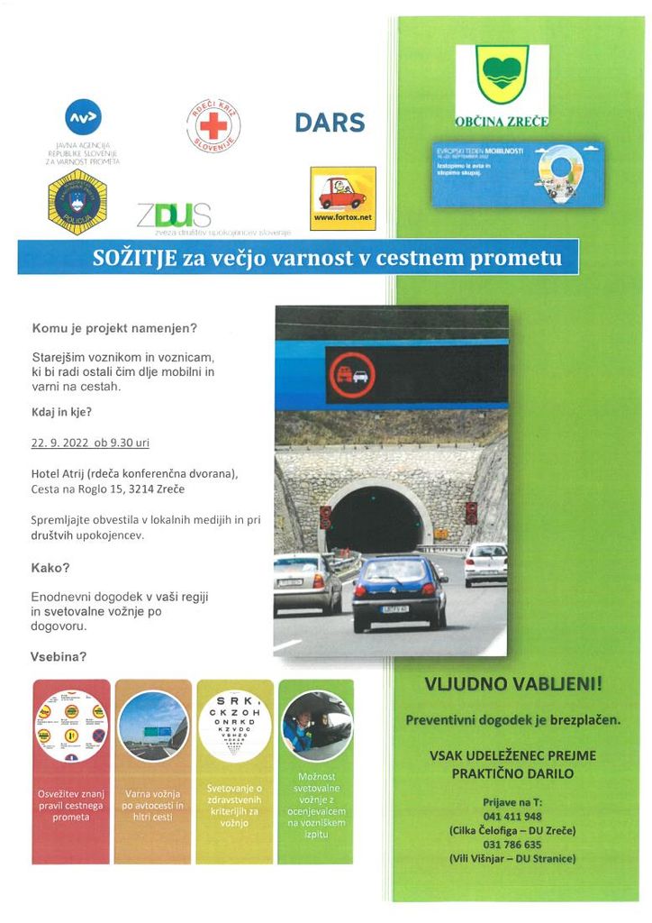 Obveščamo vas, da bo Agencija za varnost prometa Republike Slovenije, v okviru Evropskega tedna mobilnosti 2022, za seniorje in upokojence izvedla usposabljanje/predavanje za večjo varnost v cestnem prometu z naslovom "SOŽITJE za večjo varnost v cestnem prometu", ki bo v četrtek, 22. 9. 2022 ob 9.30 uri v Hotelu Atrij Zreče.