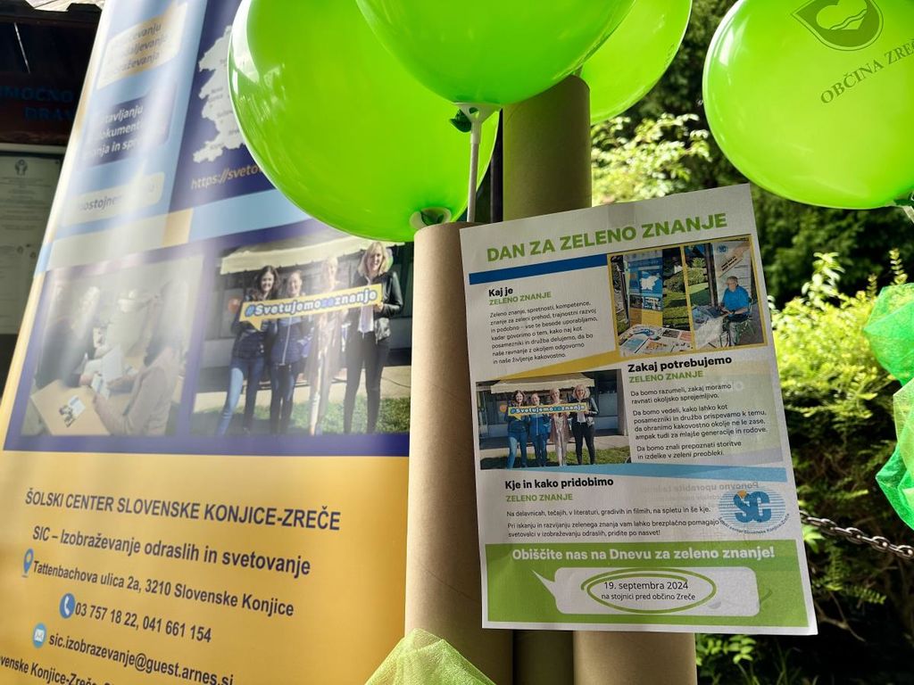 V sodelovanju s Šolskim centrom Slovenske Konjice - Zreče je v Večgeneracijskem centru Zreče v mesecu septembru potekal »Dan za zeleno znanje«, kjer smo mimoidoče informirali o trajnostnem razvoju in zelenem prehodu. Tako bomo vsi bolj razumeli, zakaj in kako postopati okoljsko odgovorno. Izvedli smo razne delavnice, obiskali so nas tako vrtčevski kot osnovnošolski otroci. Nastalo je veliko lepih izdelkov.