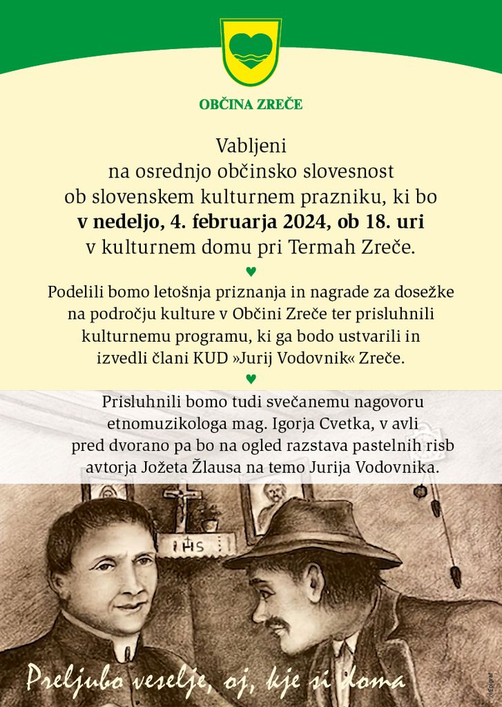 Vabljeni na osrednjo občinsko slovesnost ob slovenskem kulturnem prazniku, ki bo v nedeljo, 4. februarja 2024, ob 18. uri v kulturnem domu pri Termah Zreče.