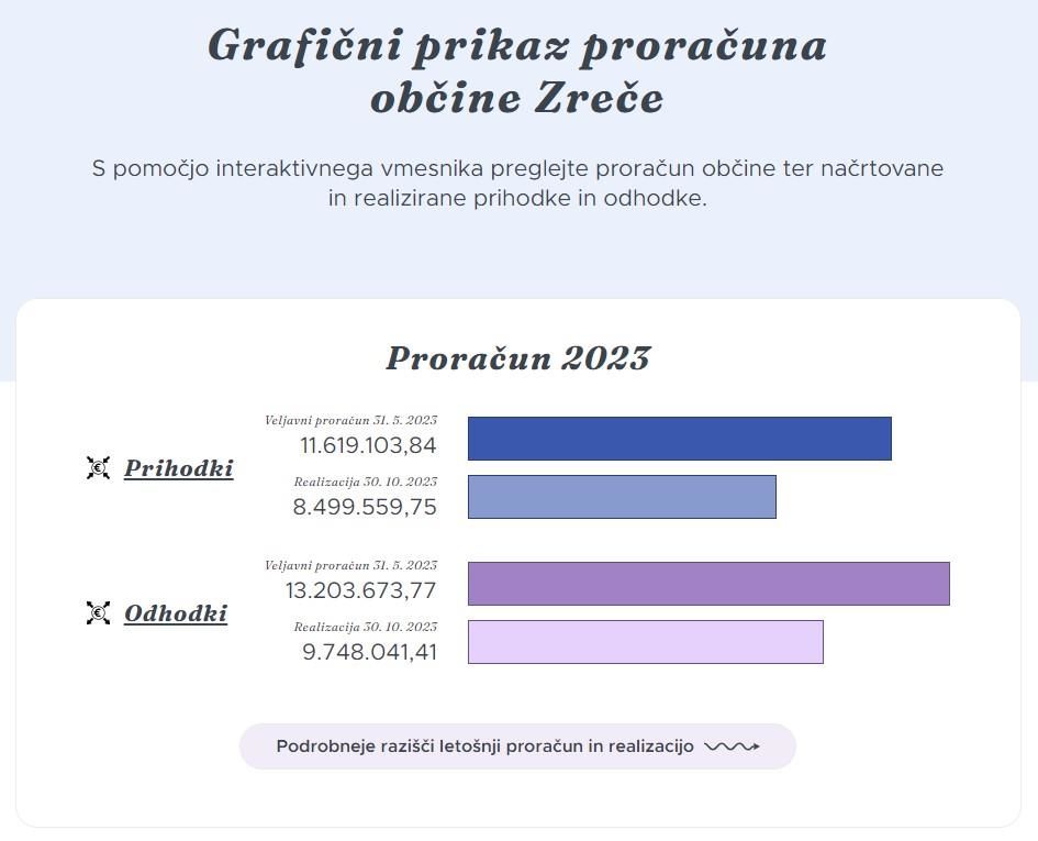 Proračun je temeljni finančni dokument, ki ga sprejme občina in predstavlja letni načrt prihodkov in izdatkov. V njem so zajeti vsi viri iz katerih občina pridobiva finančna sredstva in prav tako vsi izdatki, plačila, transferji in investicije, ki jih bo izvedla v finančnem letu. Da bi občani lahko vedeli, kaj namerava občina početi v določenem letu, je proračunski dokument vedno javno objavljen in dostopen na spletni strani občine. Ker pa vsi občani niso vešči branja mestoma zapletenega dokumenta smo v Občini Zreče pričeli z uporabo grafičnega prikazovalnika proračuna Odprti računi, ki proračunske finančne informacije preuredi v interaktivnem grafičnem vmesniku in jih prikaže v obliki lažje razumljivih grafov.