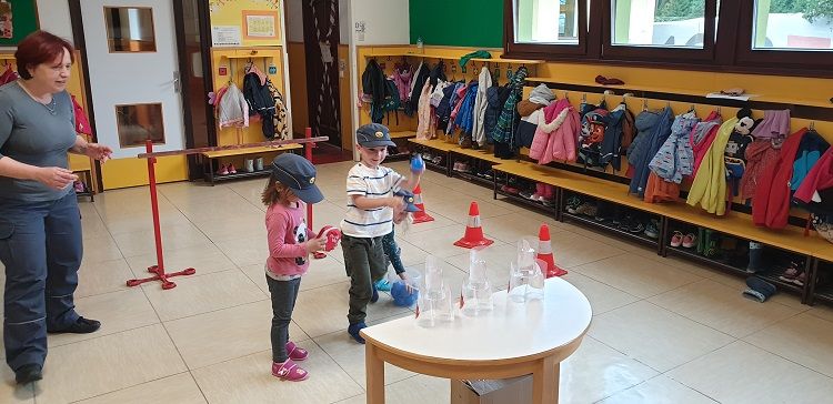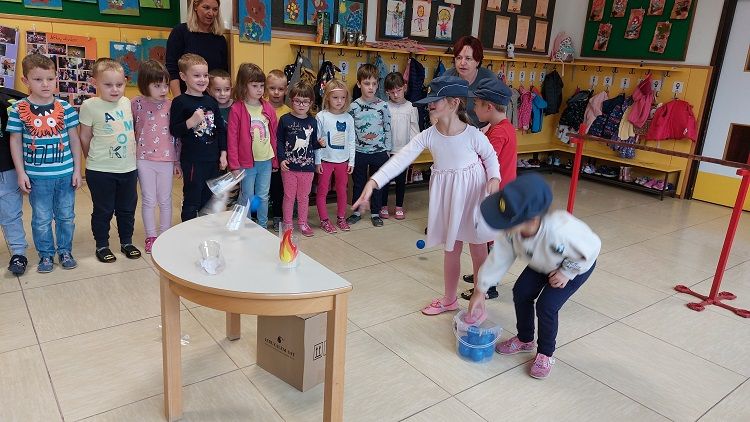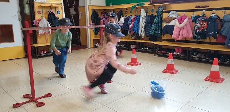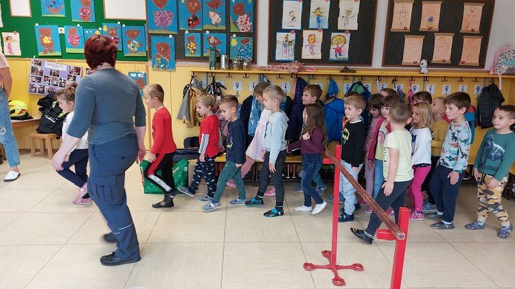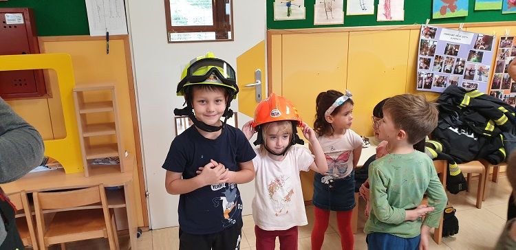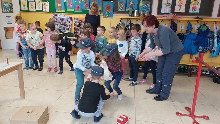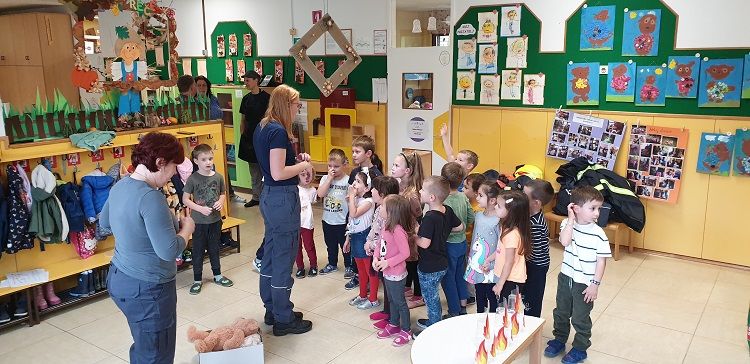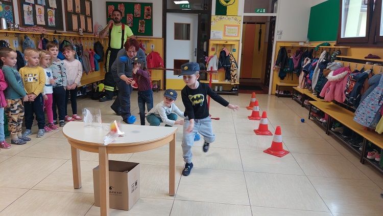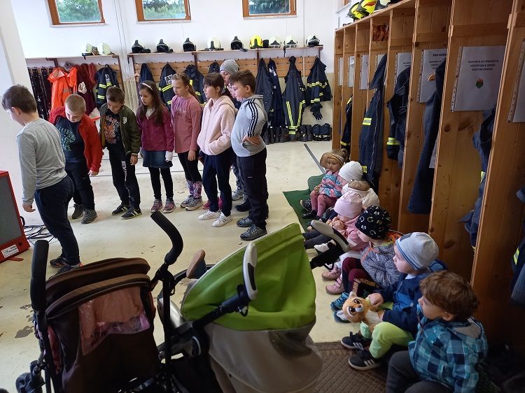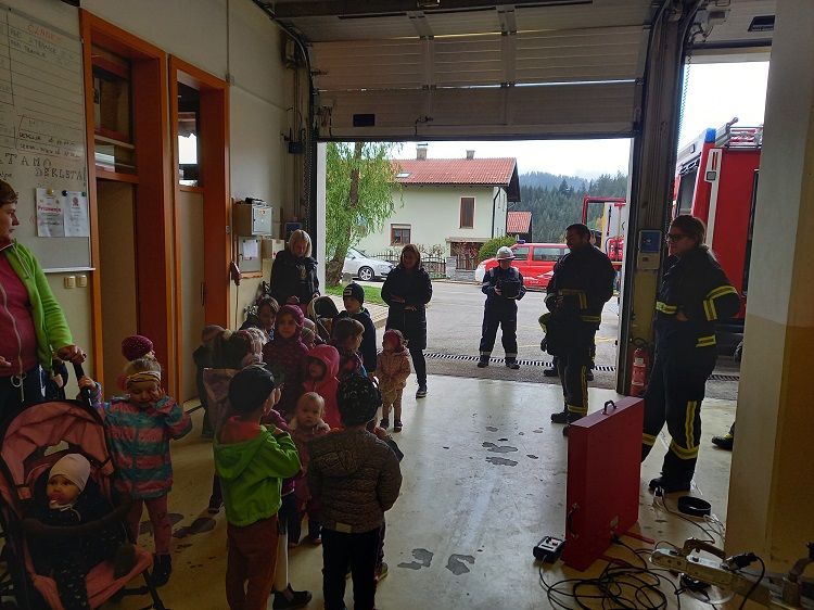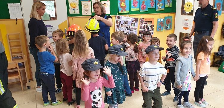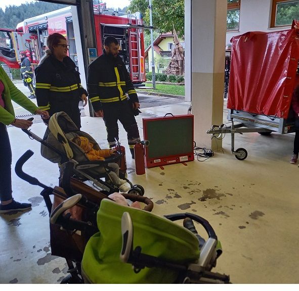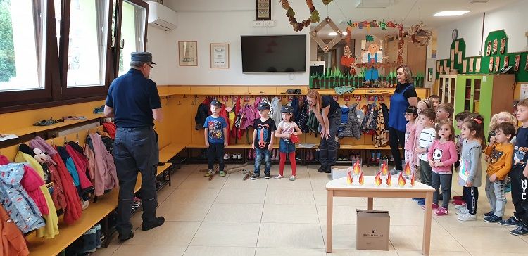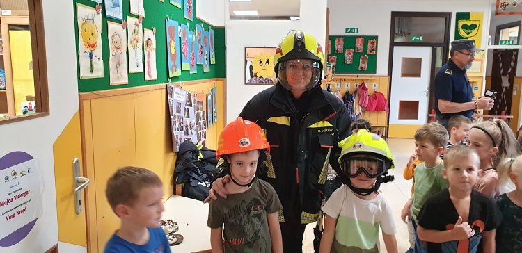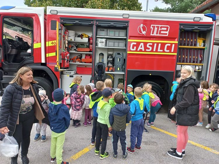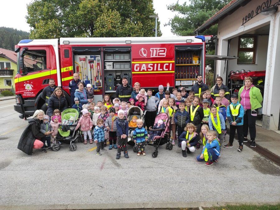 Ob mesecu požarne varnosti so nas obiskali gasilci. Otrokom so pripravili zanimive gasilske igre. Najprej so otroci prisluhnili zgodbi o nagajivem medvedku, ki je zanetil požar. Sledil je poligon, ki je vseboval; vlečenje gasilskih cevi, tek med ovirami, metanje žogic v lončke, ki so pogasili ogenj in rešili medvedka iz ognja ter ga odnesli na varno v svojo posteljico. Otroci so lahko pomerjali tudi gasilske čelade in vrhnja oblačila. Na koncu so jim gasilci razdelili tudi pobarvanke z vabilom, da lahko obiščejo tudi gasilske vaje. Otroci so z navdušenjem in velikim veseljem sodelovali v igrah. Dogodek jim bo ostal še dolgo v spominu.