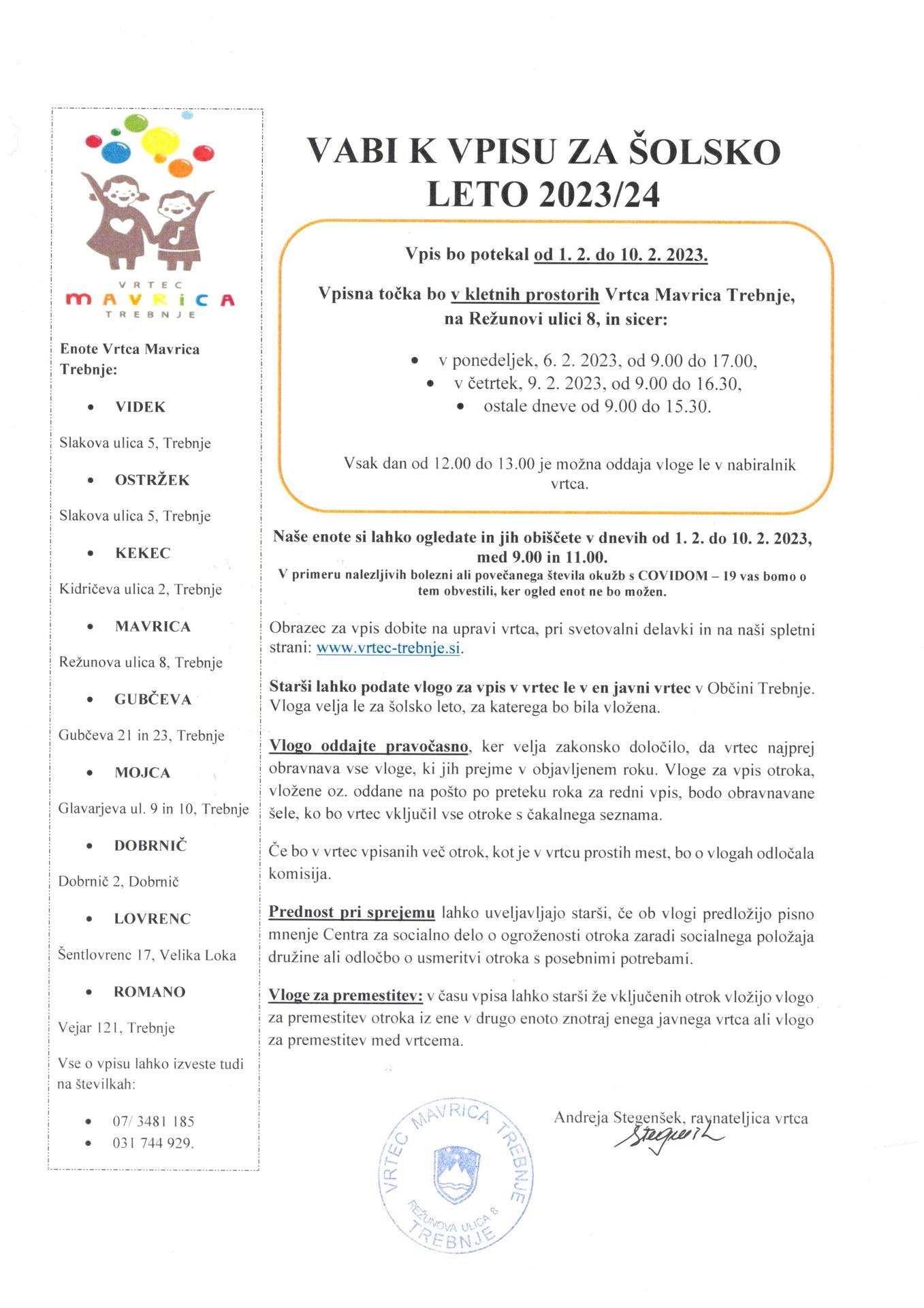 VRTEC MAVRICA VABI K VPISU ZA ŠOLSKO LETO 2023 / 2024