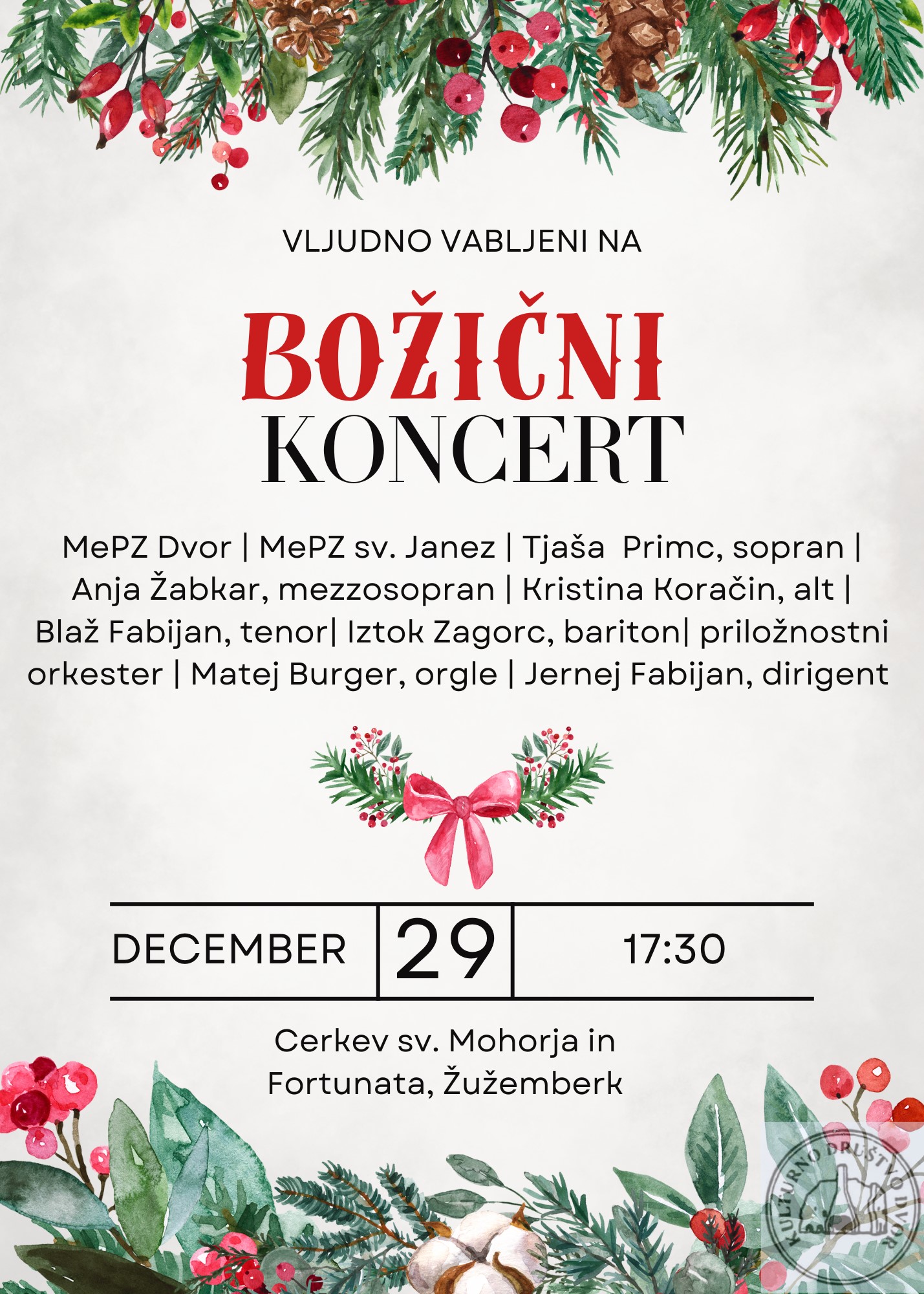 na božični koncert, v petek 29. decembra 2023, ob 17.30 uri, v cerkvi sv. Mohorja in Fortunata v Žužemberku.