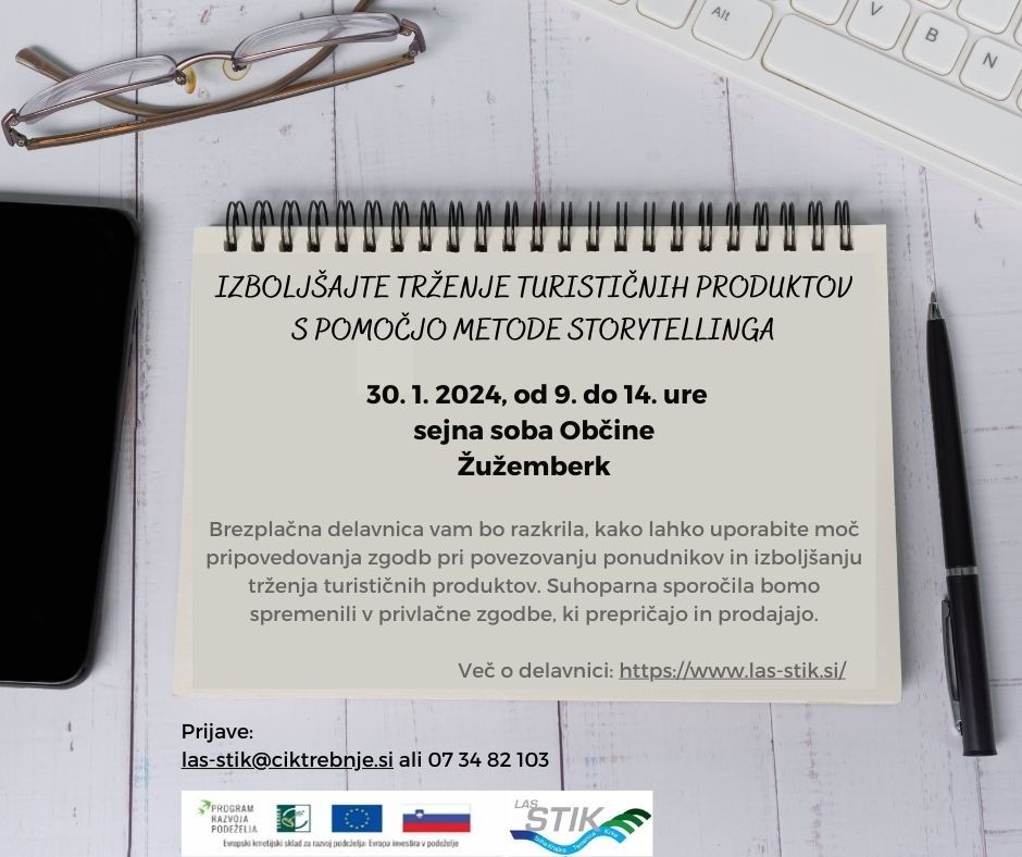 LAS STIK vabi na delavnico Izboljšajte trženje turističnih produktov s pomočjo metode storytellinga v torek, 30. 1. 2023, ob 9.00 v sejni sobi Občine Žužemberk, Grajski trg 26. Izkoristite izjemno priložnost, ki vam bo pomagala izboljšati trženje vaših turističnih produktov. Suhoparna sporočila bomo spremenili v privlačne zgodbe, ki prepričajo in prodajajo.