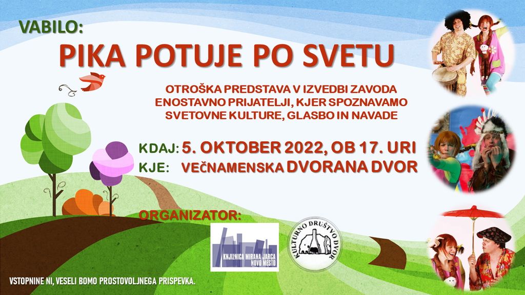 V tednu otroka vabimo otroke na poučno interaktivno otroško predstavo »PIKA POTUJE PO SVETU« v izvedbi Zavoda Enostavno Prijatelji, kjer bomo spoznavali svetovne kulture, glasbo in navade.