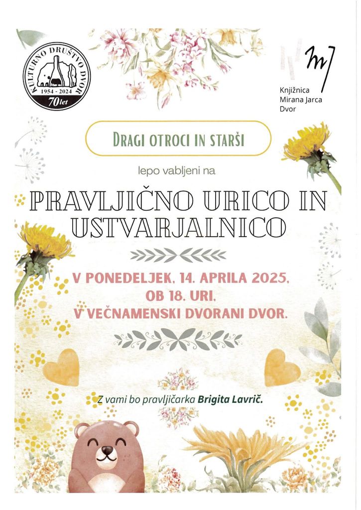 Vabljeni na pravljično urico in ustvarjalnico v ponedeljek, 14. 4. 2025 ob 18.uri v VEČNAMENSKO DVORANO DVOR. Z vami bo pravljičarka Brigita Lavrič.