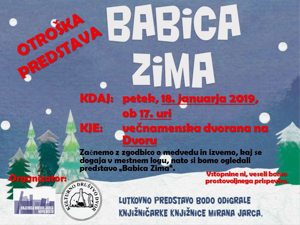 Kulturno društvo Dvor v sodelovanju s Knjižnico Mirana Jarca Novo mesto organizira predstavo za otroke "BABICA ZIMA", v petek, 18. januarja 2019, ob 17. uri, v večnamenski dvorani na Dvoru.