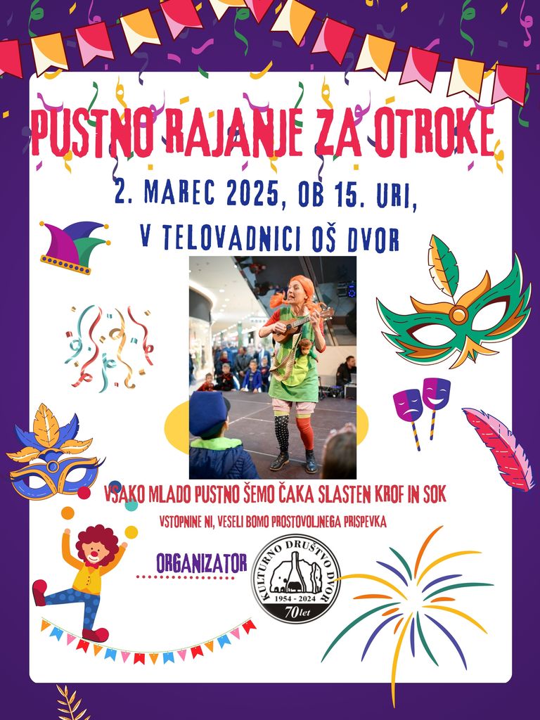 Mamice, očki, tete, strici, bratci, sestrice, ... pripeljite otroke na Dvor, na tradicionalno pustno rajanje, ki bo v nedeljo, 2. marca 2025, s pričetkom ob 15. uri, v telovadnici Osnovne šole Dvor.