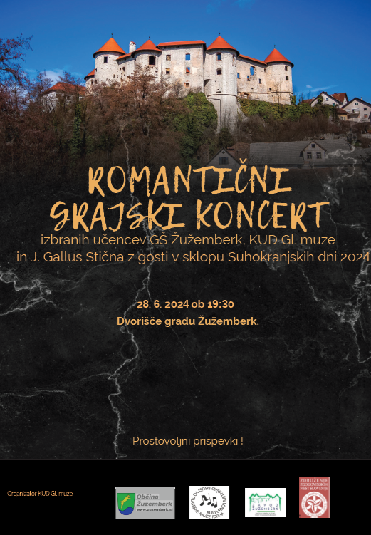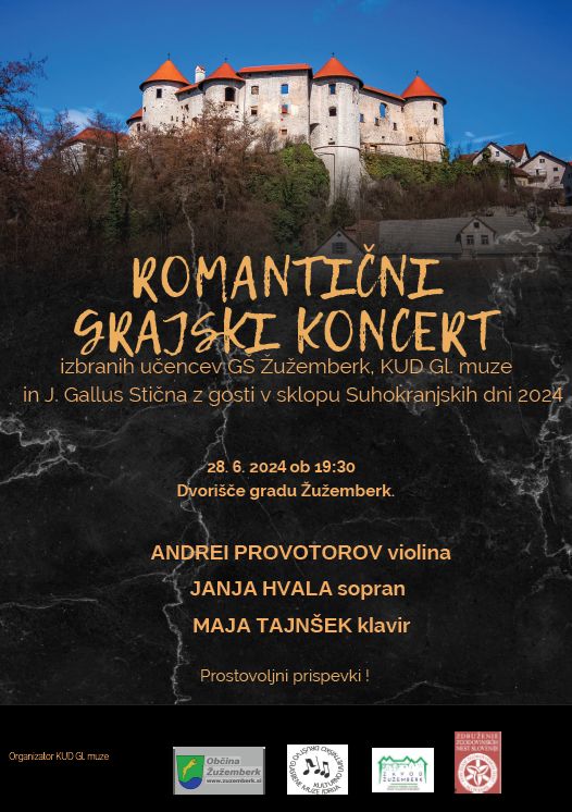 19.30 Romantični grajski koncert izbranih učencev GŠ Žužemberk, KUD Gl. muze in J. Gallus Stična z gosti.
