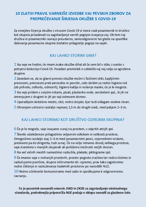 Lepo prosimo, da pripeljete samo zdrave otroke, pogovorite se z njimi glede varnosti, ki veljajo za preprečevanje okužbe s Covidom-19. Tudi mi, člani KD Dvor, se bomo potrudili, da zadostimo vsem zahtevam, kar se tiče varnosti vseh nas!V prilogi povabilo in 10 zlatih pravil za varnejšo izvedbo otroških pevskih vaj.