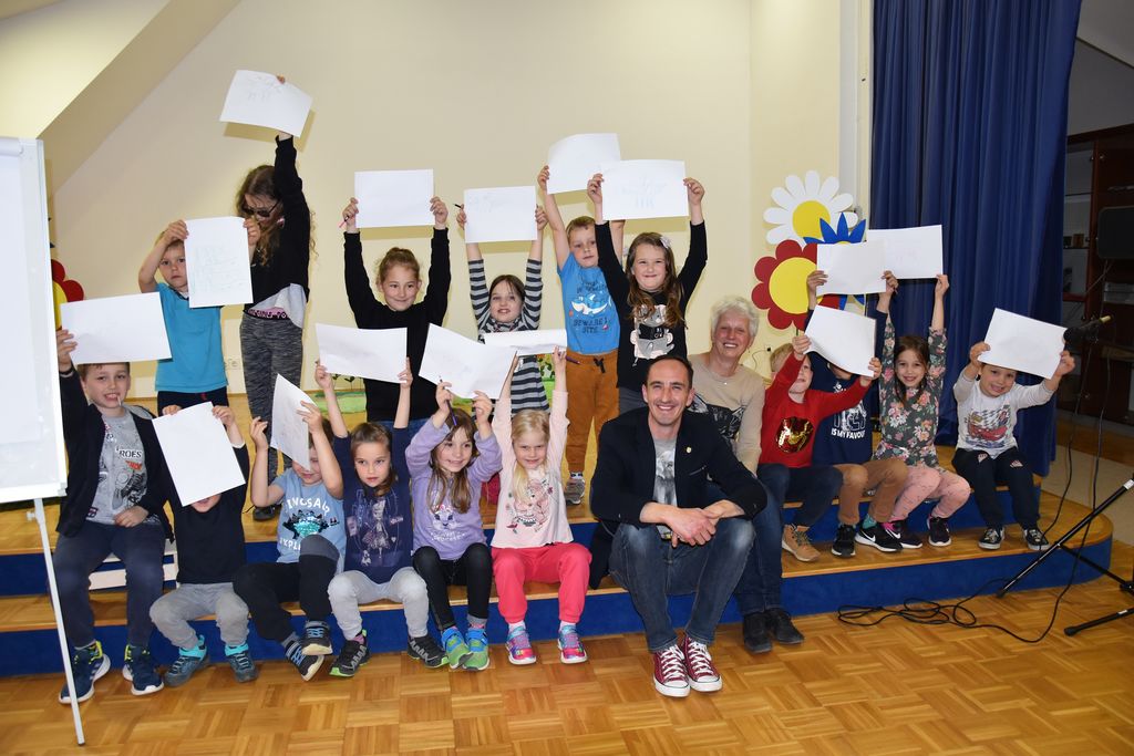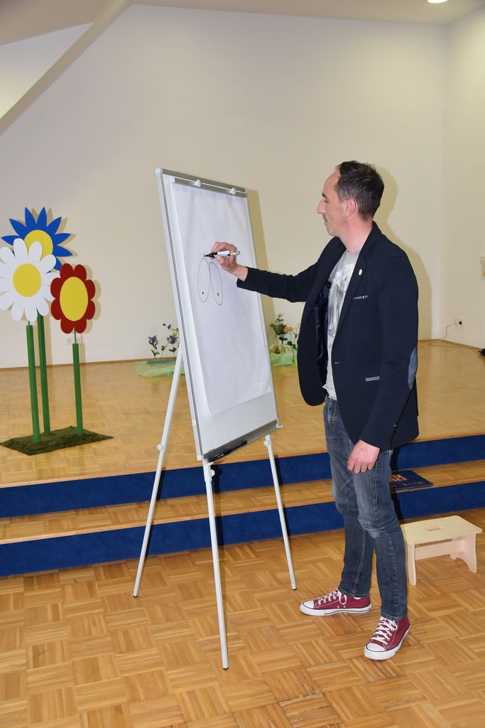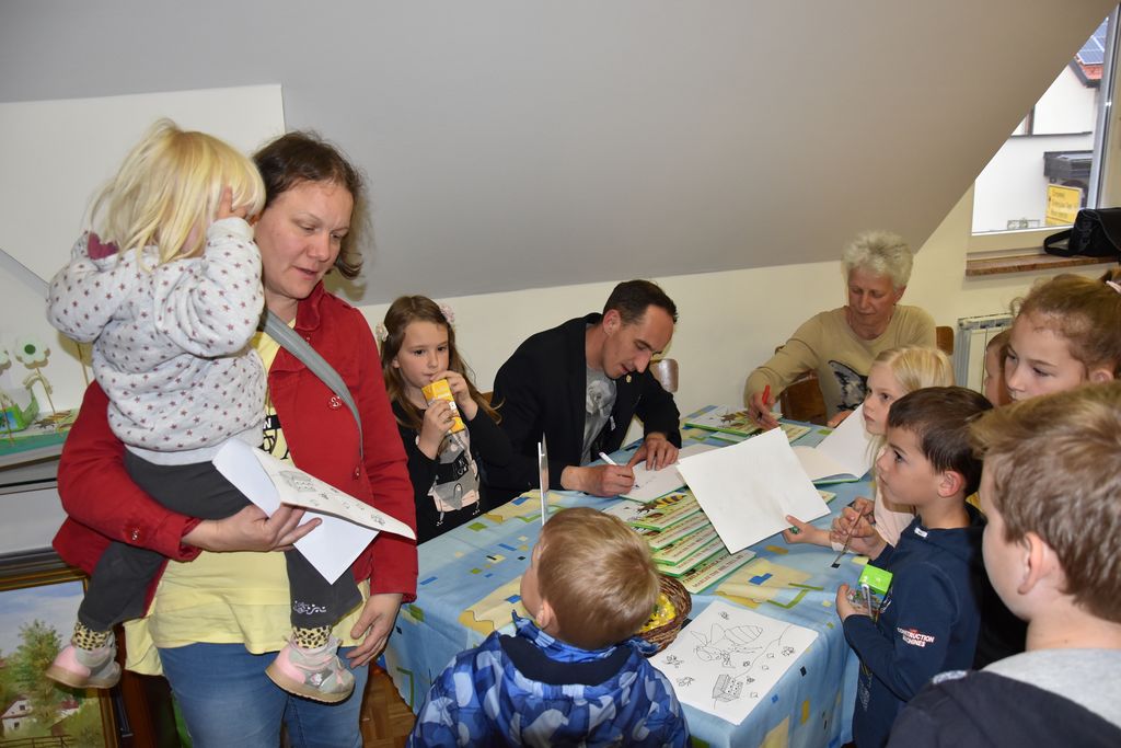Ilustrator, domačin, Rožle Matko je otroke zabaval skozi delavnico ilustriranja. Pokazal je, kako narisati čebelo Mihaelo po korakih, in ne samo to, skupaj z otroci se je uril v risanju le-te z zaprtimi očmi.