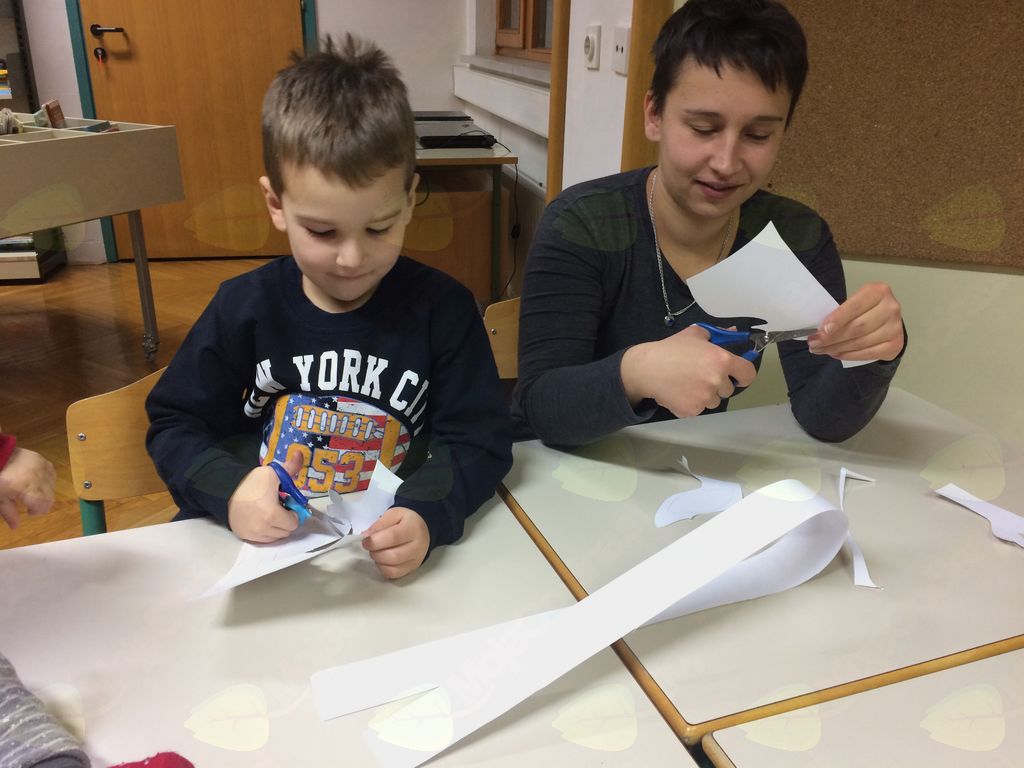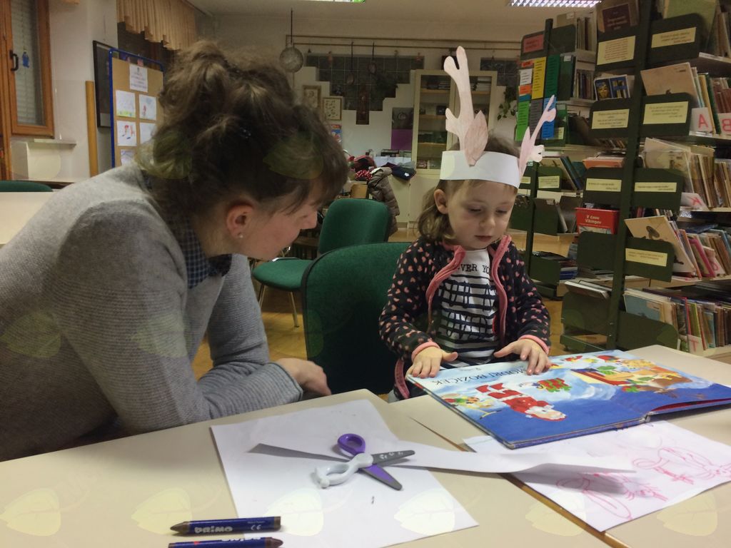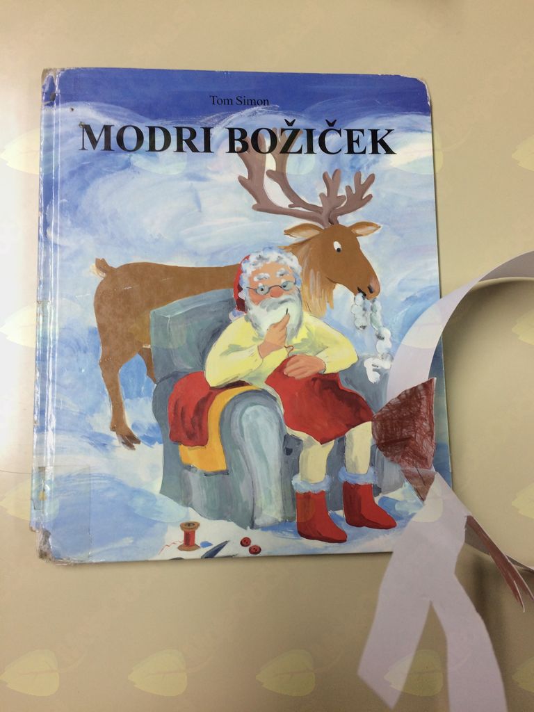 V čarobnem decembru smo na drugih pravljičnih uricah poslušali pravljico o modrem Božičku. Ker se mu je oblačilo po nesreči obarvalo na modro barvo je njegov tradicionalni prevoz zamenjal za čoln. Konec ni bil ravno najboljši… zato si želimo, da do te nesreče nebi nikoli več prišlo. Mi pa smo se spremenili v njegove zveste pomočnike jelenčke.