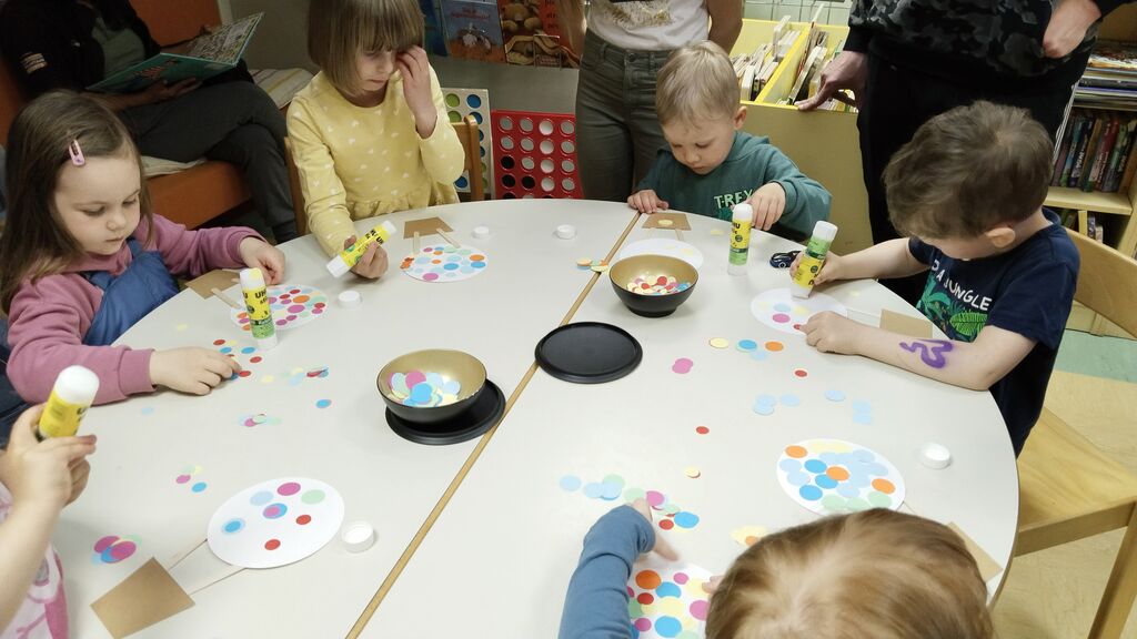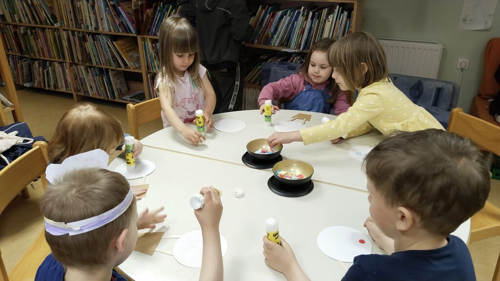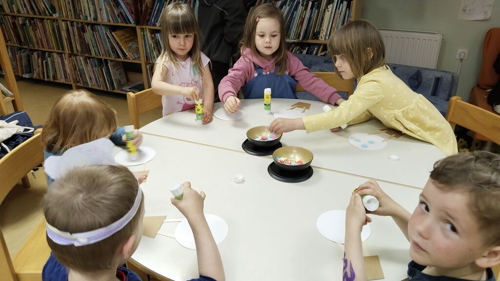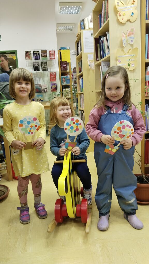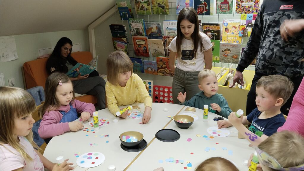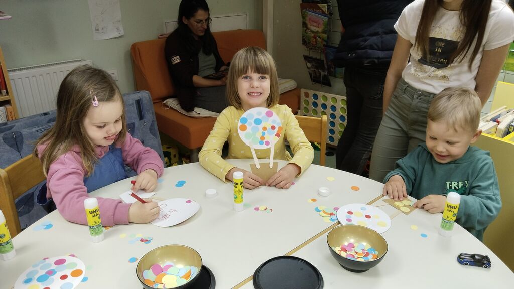 Po pravljični uri so otroci svojo ustvarjalnost izrazili še z ustvarjanjem pisanih balonov – nanje so prilepili barvne krogce v najrazličnejših odtenkih. Ti baloni so simbolično ponazarjali vrnitev barv v mesto Direndaj ter hkrati opominjali, da prav vsak izmed nas nosi v sebi moč, da s prijaznostjo in dobrino obarva svet okoli sebe.