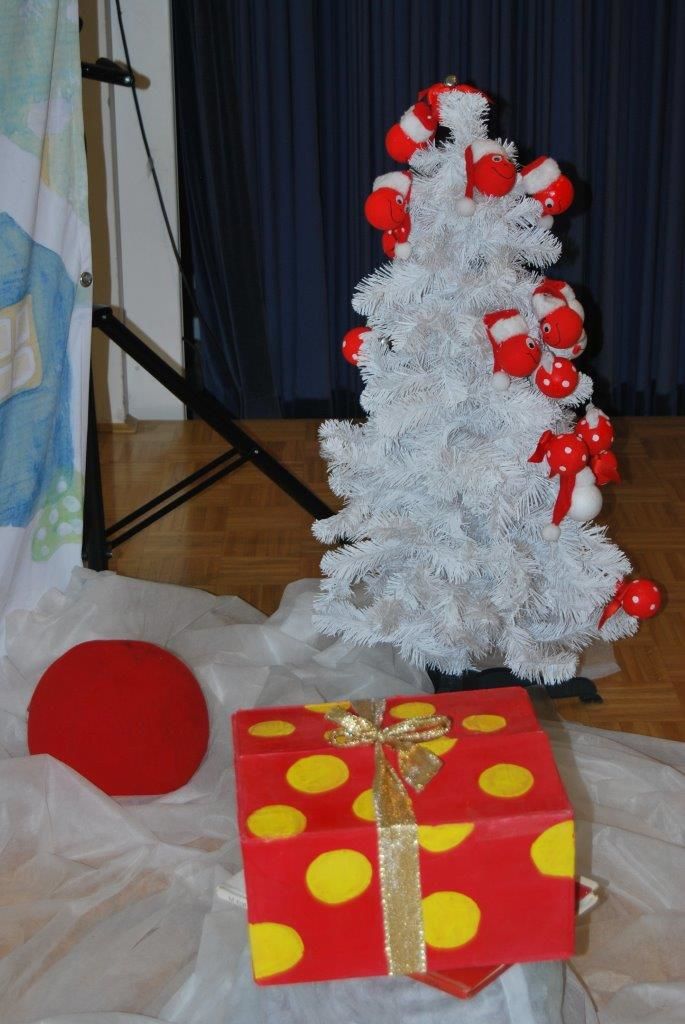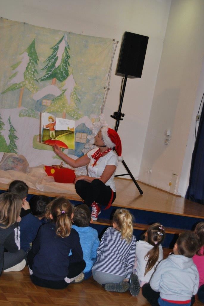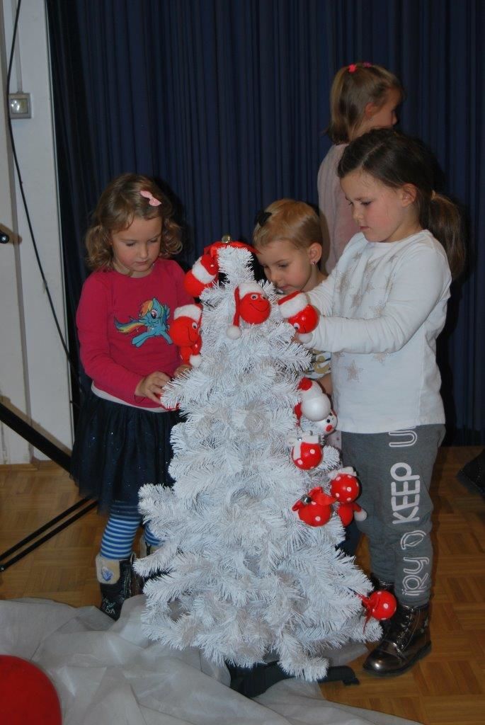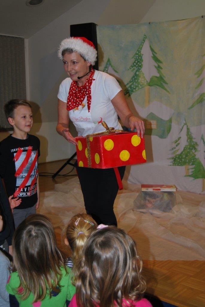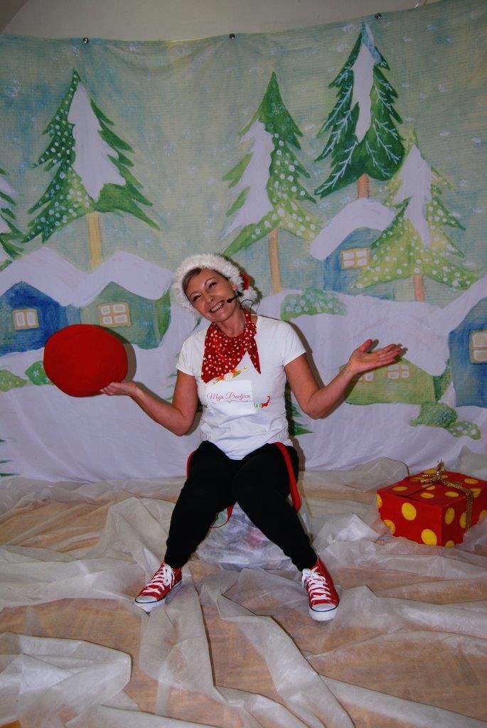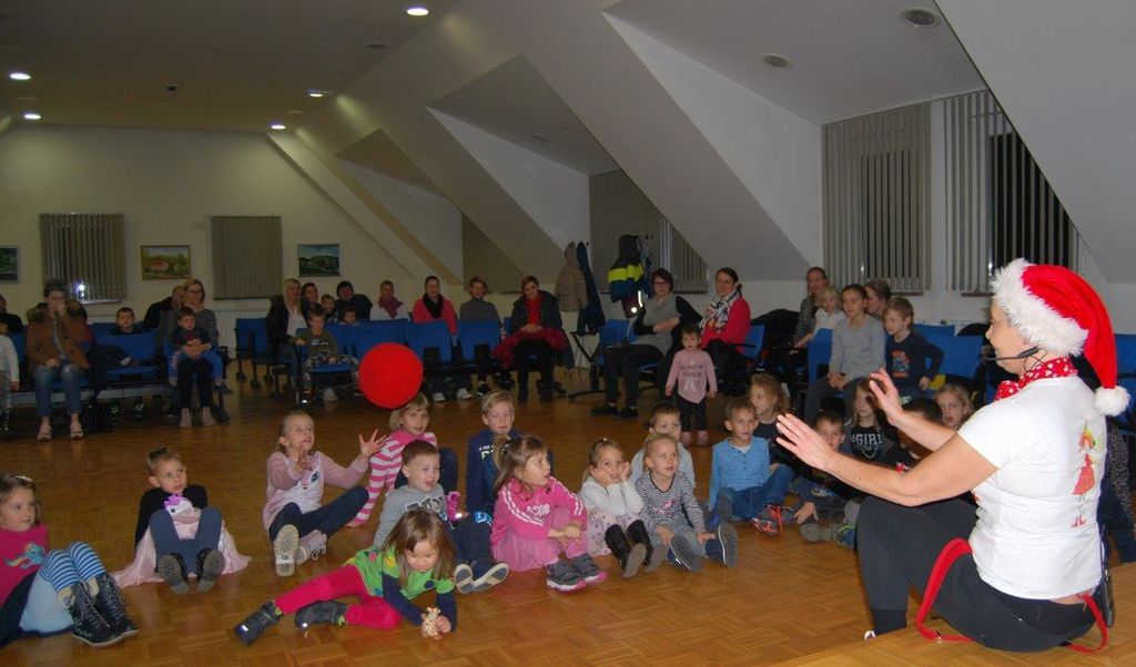 Da bi povezali Ta veseli dan kulture in pred kratkim obeležen Dan splošnih knjižnic, ki ga že od leta 2002 slovenske splošne knjižnice obeležujemo vsako leto, 20. novembra, je Maja v svojo nadvse igrivo in hudomušno predstavo vključila tudi knjigo Rdeča žoga. Prebrala je pravljico, ki govori o tem, da ima vsak otrok  žogo ali pa si jo želi. Mnogim žoga postane prijateljica... Lizina žoga pripoveduje o tem, kako se igra z Lizo. Liza in vsi njeni prijatelji jo občudujejo, ker je tako velika in tako zelo rdeča. Maja pa je prinesla tudi svojo rdečo žogo, s katero se je žogala z otroci ob spremljavi pesmi Rdeča žoga, katero so zapeli tudi otroci. V igro, petje in ples  ob spremljavi hudomušnih in igrivih pesmic,  je animatorka vključila tako otroke kot tudi starše. Ker pa je že nastopil veseli december, ni šlo brez okrasitve novoletne jelke. Otroci so z rdečimi bunkicami okrasili drevešček in na koncu občudovali svojo umetnino.