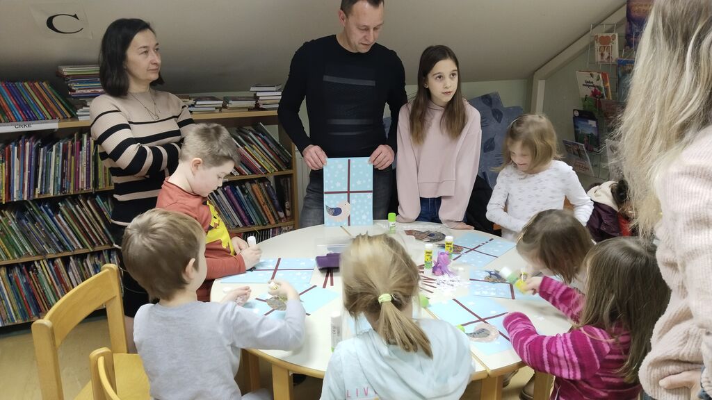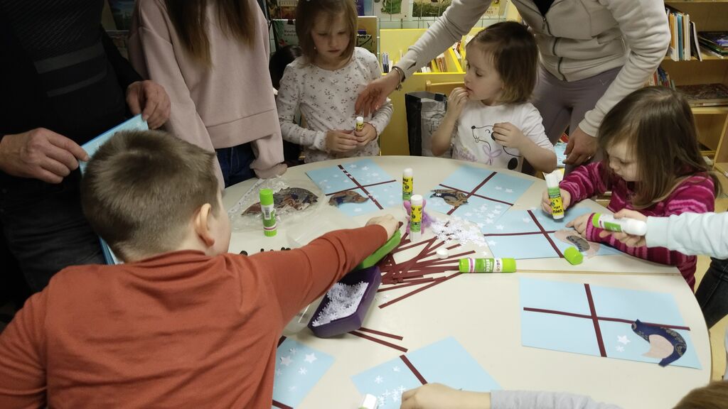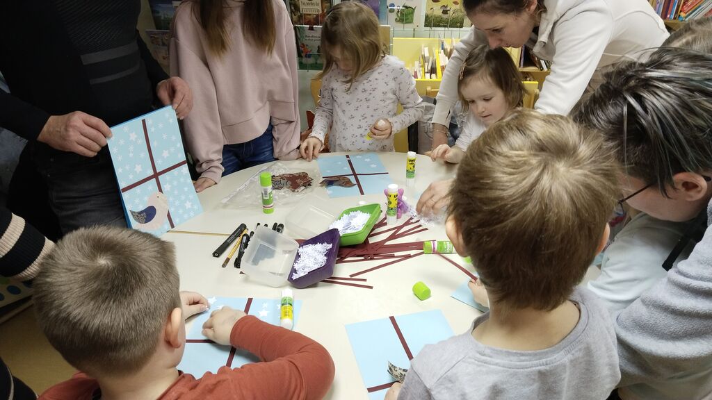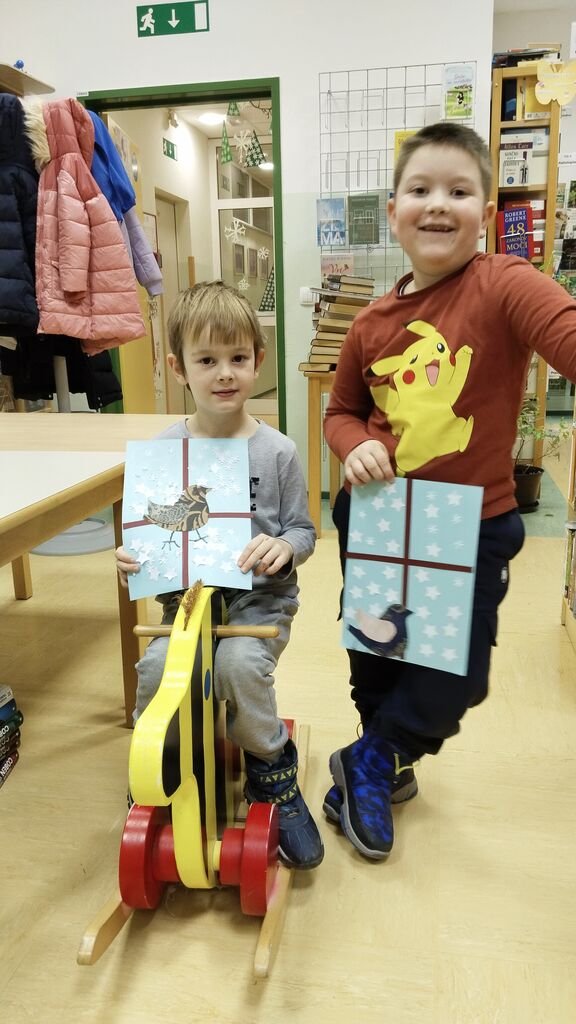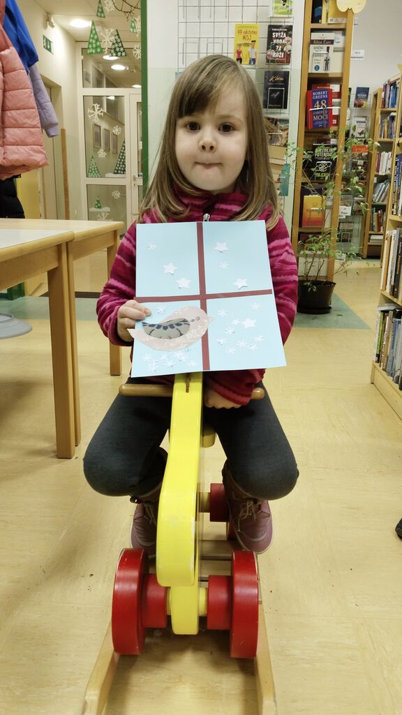 Po pravljici so otroci ustvarjali sliko z motivom taščice na oknu – zimske ptice, ki simbolizira toplino, upanje in bližino narave tudi v najhladnejših dneh.