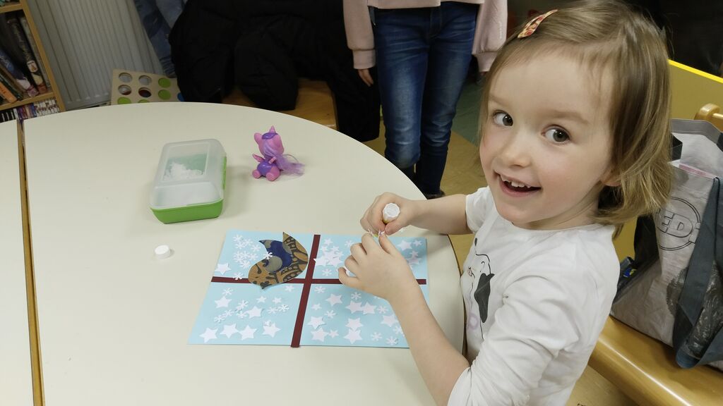 Novo leto smo začeli s pravljično urico v pravem zimskem vzdušju. Ob branju slikanice smo se podali v zgodbo o radovedni taščici, ki na lep jesenski dan opazi, da se v naravi dogaja nekaj nenavadnega. Listje se vrtinči v vetru, živali so v naglici, ptice se odpravljajo na jug, gozd pa se počasi pripravlja na prihod zime. Medtem ko druge živali vedo, kaj prihaja, taščica z zanimanjem in radovednostjo odkriva pomen teh skrivnostnih sprememb. Zgodba nas je popeljala skozi menjavanje letnih časov ter poudarila, da so spremembe del naravnega ritma življenja in da prinašajo novo svežino tudi v hladnih zimskih dneh.