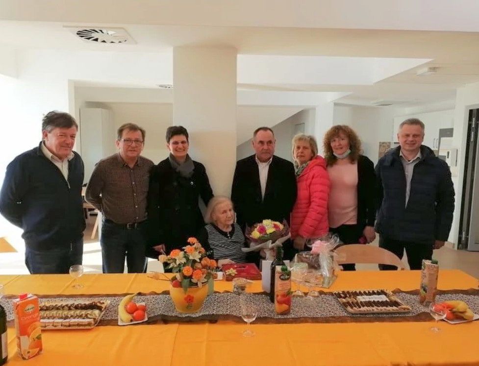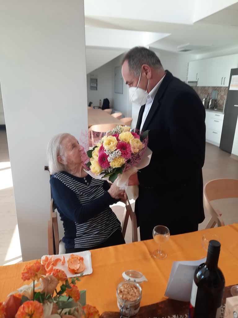 Gospod župan Jože Papež in predstavniki Občine so se z veseljem odzvali vabilu in skupaj so s predstavnico RK Žužemberk Alenko Sajovec, obiskali najstarejšo suhokranjko v domu starejših v Metliki.
