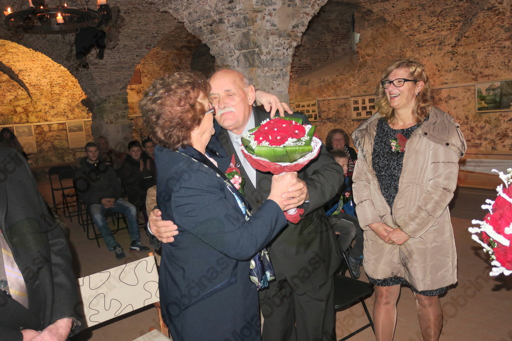 V soboto, 28. novembra , sta v krogu domačih in prijateljev praznovala zlato poroko zakonca Olga in Marjan Romih. Po petdesetih letih sta obnovila svojo zakonsko zaobljubo pred županom Občine Žužemberk Francem Škufco, pooblaščeno matičarko Marico Ban in pričama, hčerko Mirjano in partnerjem Matjažem. Civilni  obred poroke je potekal v grajski kleti tisočletnega  gradu Žužemberk, kjer sta si zlatoporočenca   nataknila prstana in ponovila zaobljubo. Župan Škufca  je zlatoporočencema   izrekel čestitke in   zaželel še veliko skupnih let ter  jima izročil šopek s svečano listino. Marjan se je rodil 20.12.1942, najprej izučil za zidarja, po končanem vojaški obveznosti se je zaposlil kot miličnik.  Končal je pravno fakulteto in ostal v službi policije na različnih delovnih mestih vse do upokojitve leta 1992.  Žena Olga se je rodila  26.8.1943, po domače Štravsova , delala je v bolnišnici, nato je vse do upokojitve je službovala kot referentka na upravni enoti Ljubljana. Po poroki 27.11.1965 sta vsa leta živela v Ljubljani, po upokojitvi pa sta se leta 1992 preselila v Stavčo vas pri Dvoru. V zakonu se jima je rodila hči Mirjana, vesele trenutke v življenju pa delita še s tremi vnuki in pravnukom. V Stavči vasi je bilo veselo že dan prej, ko so   jima vaščani postavili slavnostni mlaj. Zlatoporočenca sta po poročnem obredu nadaljevala slavje v krogu  družine, prijateljev in  sorodnikov  v kmečkem turizmu v Žužemberku.  Čestitki se pridružuje tudi uredništvo!